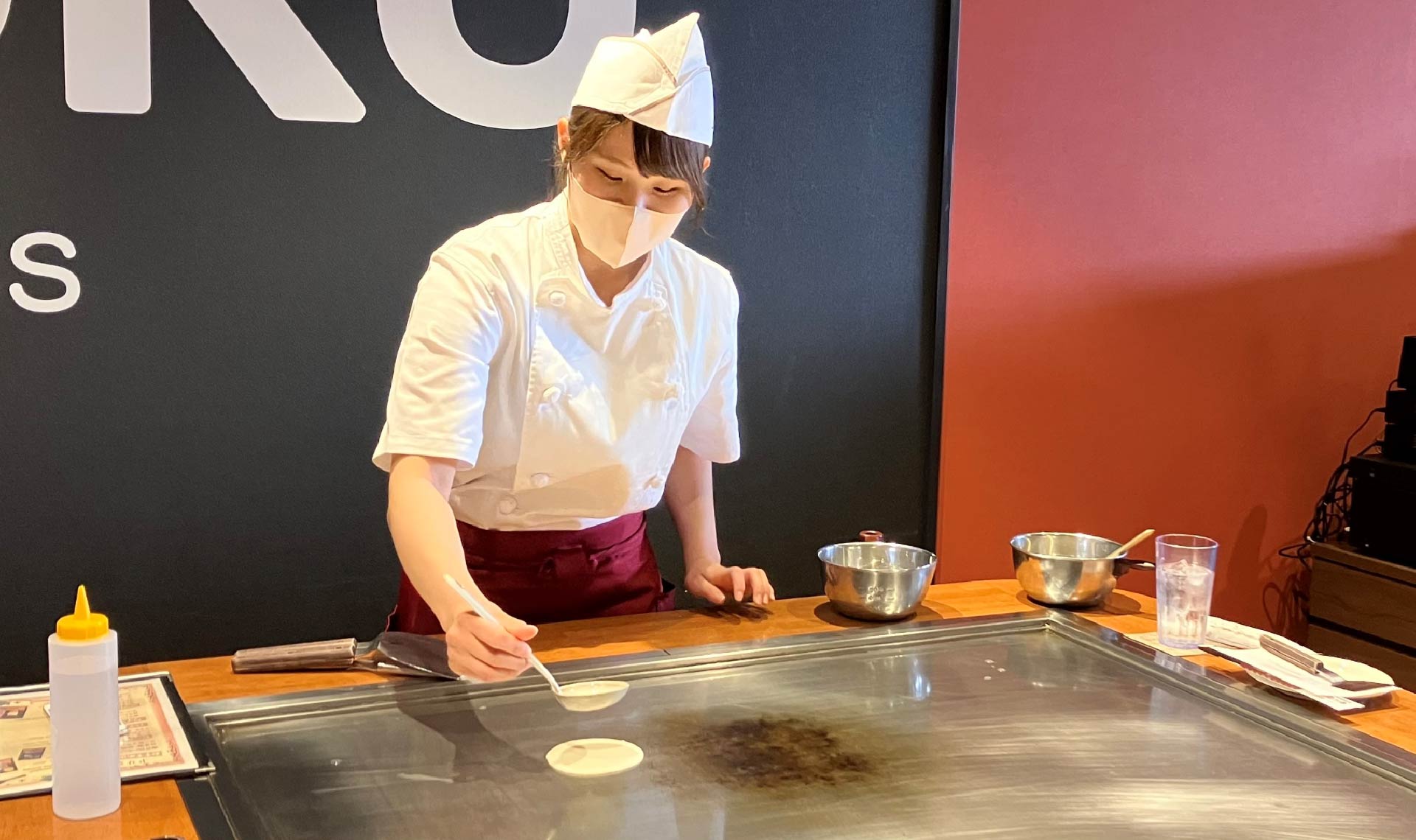 OKOSTAは、はじめてお好み焼きを作るという方も大丈夫!おいしく焼く方法やきれいに作るポイントをていねいに、わかりやすく教えてくれ「お好み焼士」さんが付いてサポートしてくれます。優しくて笑顔がすてきなお好み焼士さんに、はじめてのお好み焼きづくりもリラックスして楽しめました。