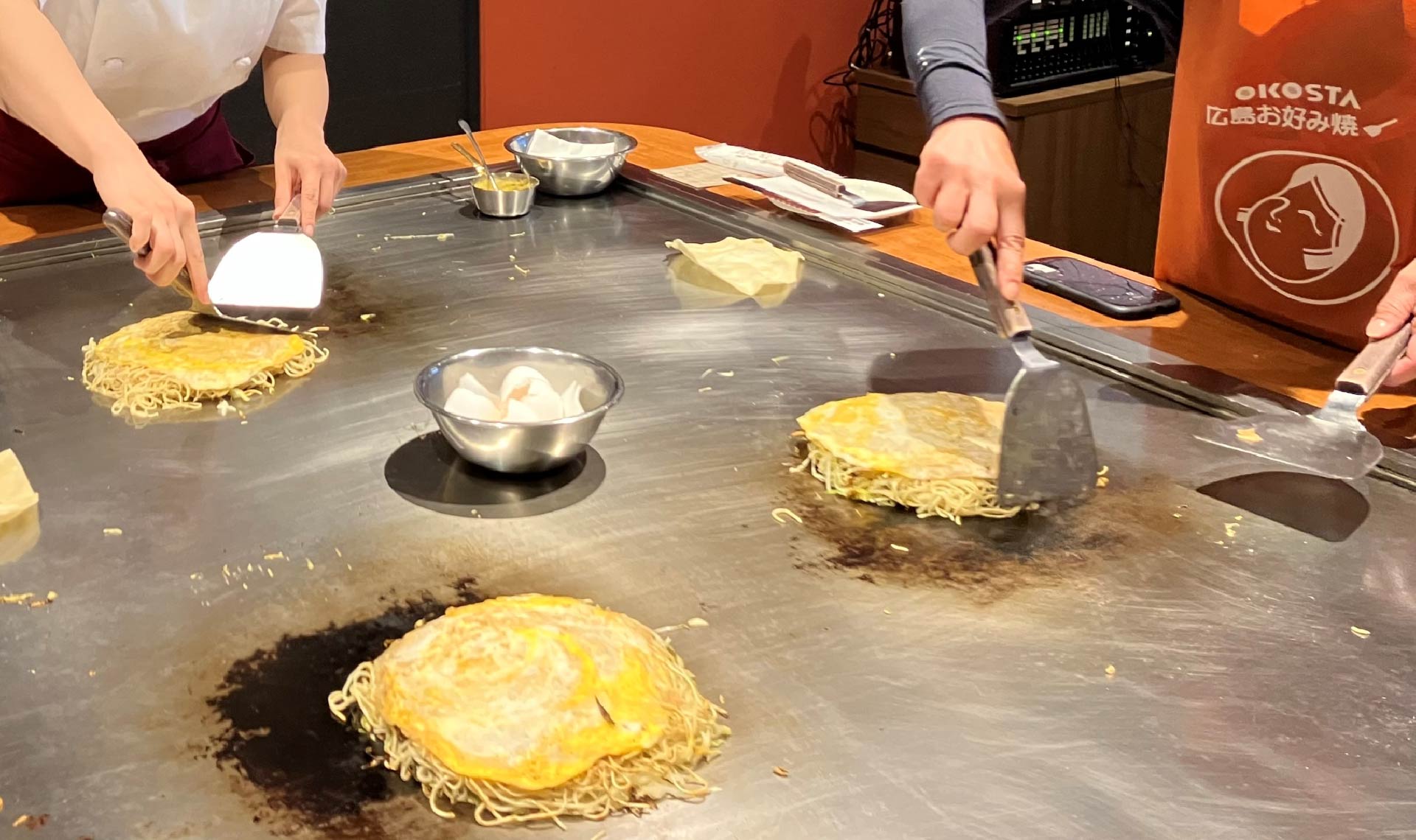 広島駅から徒歩2分の場所にあるお好み焼体験スタジオ「OKOSTA」。小学生以上であれば、子どももお好み焼きづくりを体験できます。