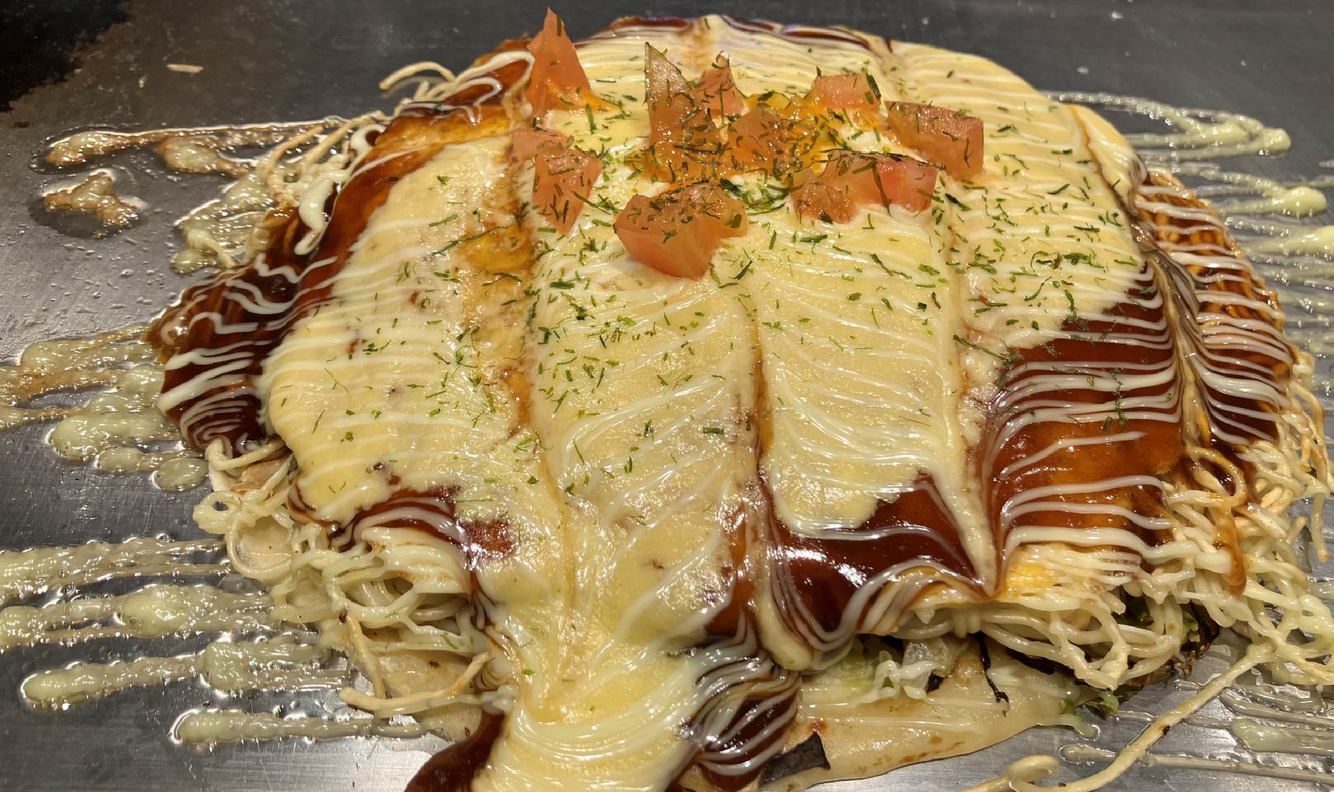 お好みソース、青のり、トッピングのチーズとトマト、マヨネーズをかけて完成。