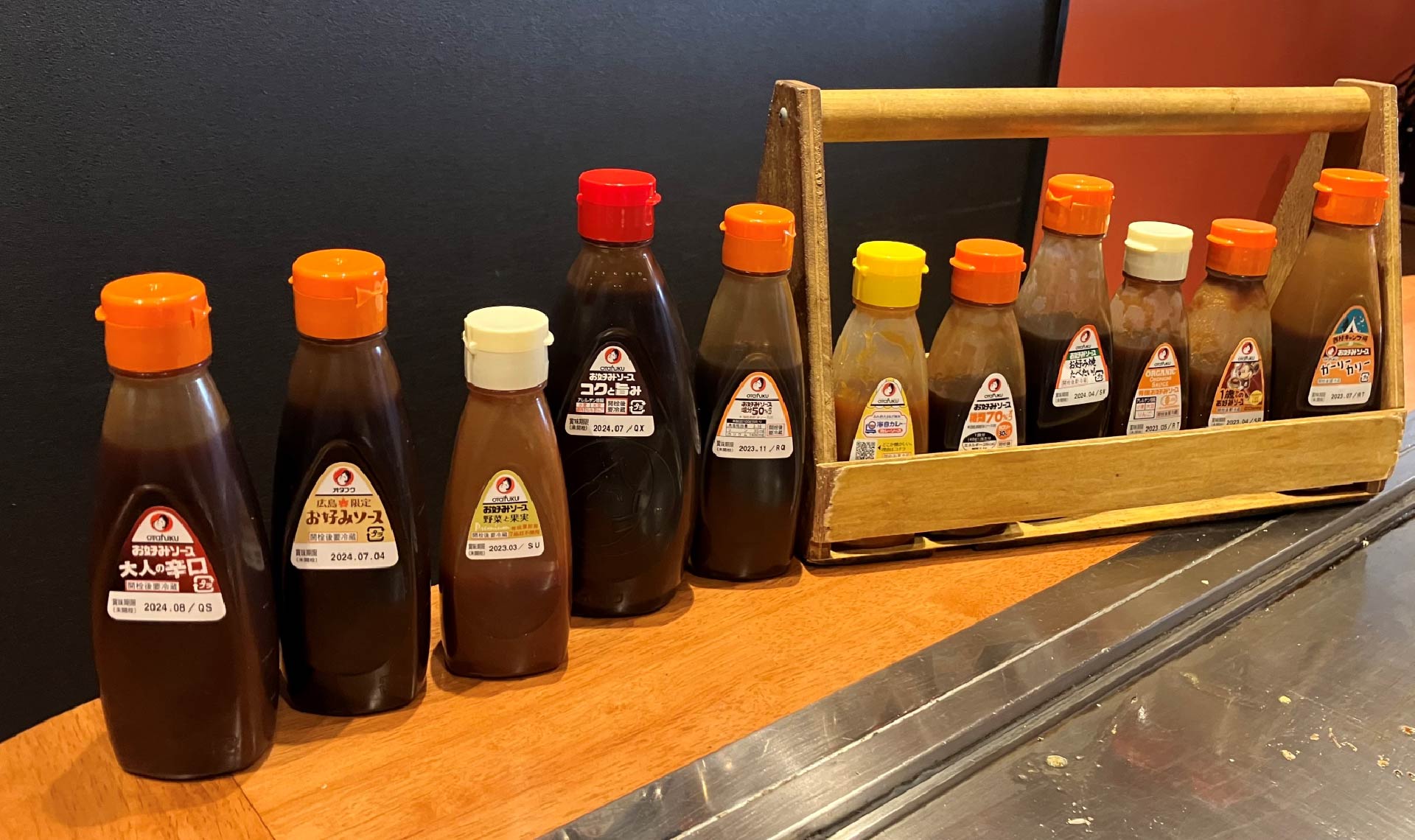練習で焼いた生地を使って、さまざまなお好みソースの味も楽しめます。テレビ番組とタイアップした商品や、昔ながらのオタフクソース、1歳から食べられるソースなど種類豊富です。