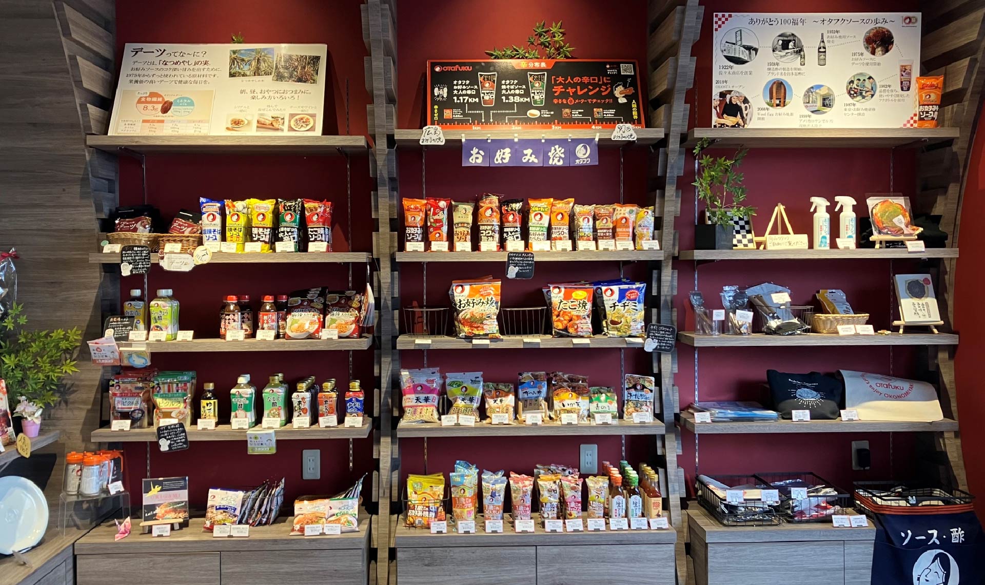 体験で使用したお箸やコテなどは、おみやげコーナーで購入可能です。ソースの他にも、さまざまな種類のタレやお酢、オタフクオリジナルのグッズが充実しています。眺めるだけでも楽しくなりますよね。