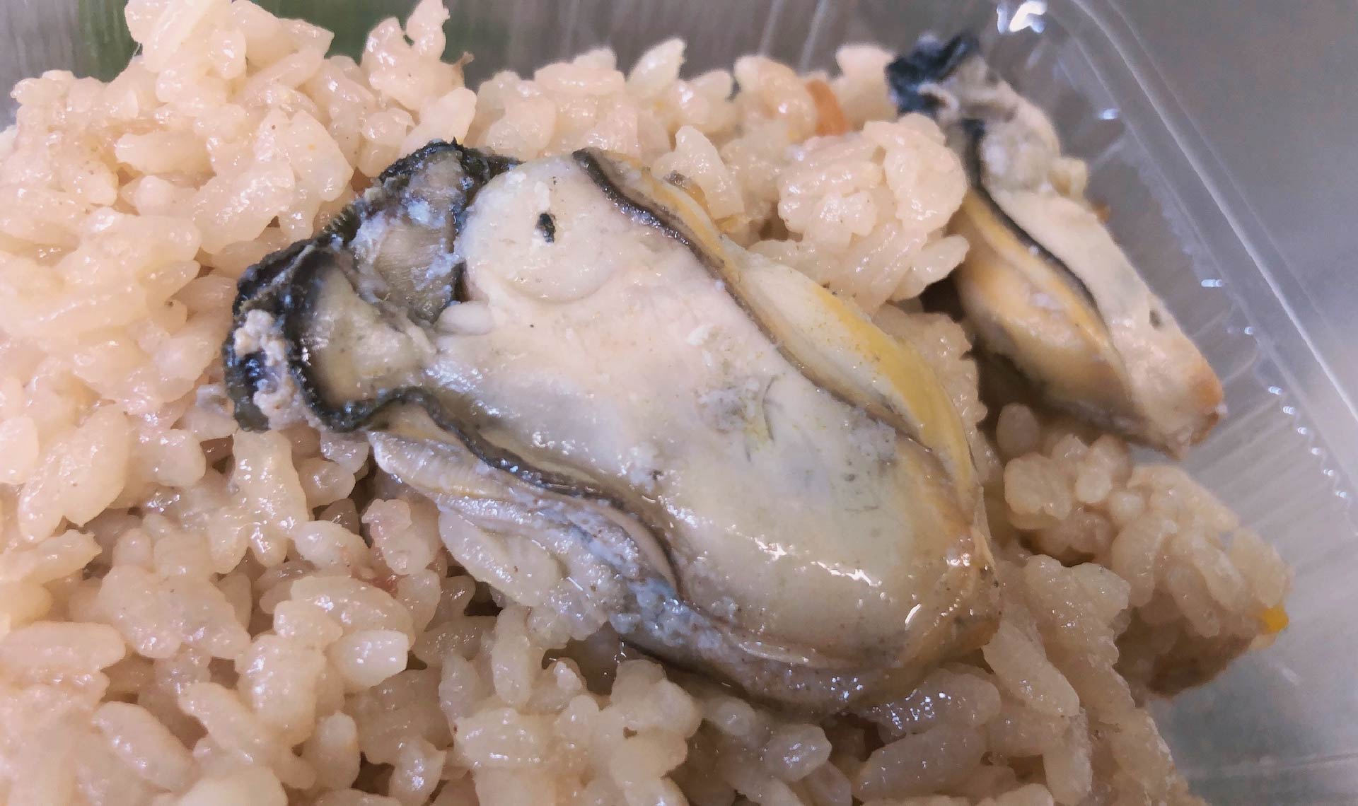 私はこれが今年初の広島牡蠣。コクがありプリプリとした身はまさに広島の冬の味覚です。こんなに大きな広島牡蠣が3つも入ってたった350円。生牡蠣はあっという間に売り切れて、この炊き込みご飯も私が手に入れたのが最後の一個でした。やはりこの時期の牡蠣は地元の人たちにも人気がありますね。