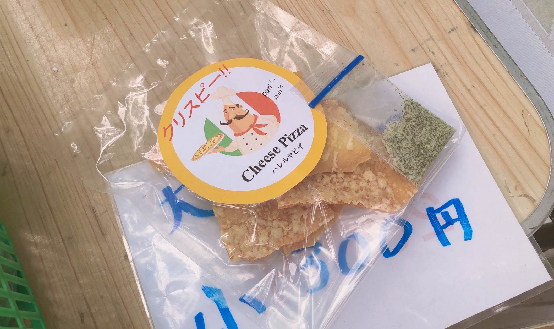 開催日によって出品物も変わりますが今回特に気に入ったのがこちらのパリパリチーズピザ。安佐北区にあるテイクアウトピザ専門店の「ハレルヤピザ」というお店の商品ですが農家さんを経由して出品しているとのこと。チーズを焼いてかためた濃厚なお菓子で、ワインのおつまみにもなりそうです。