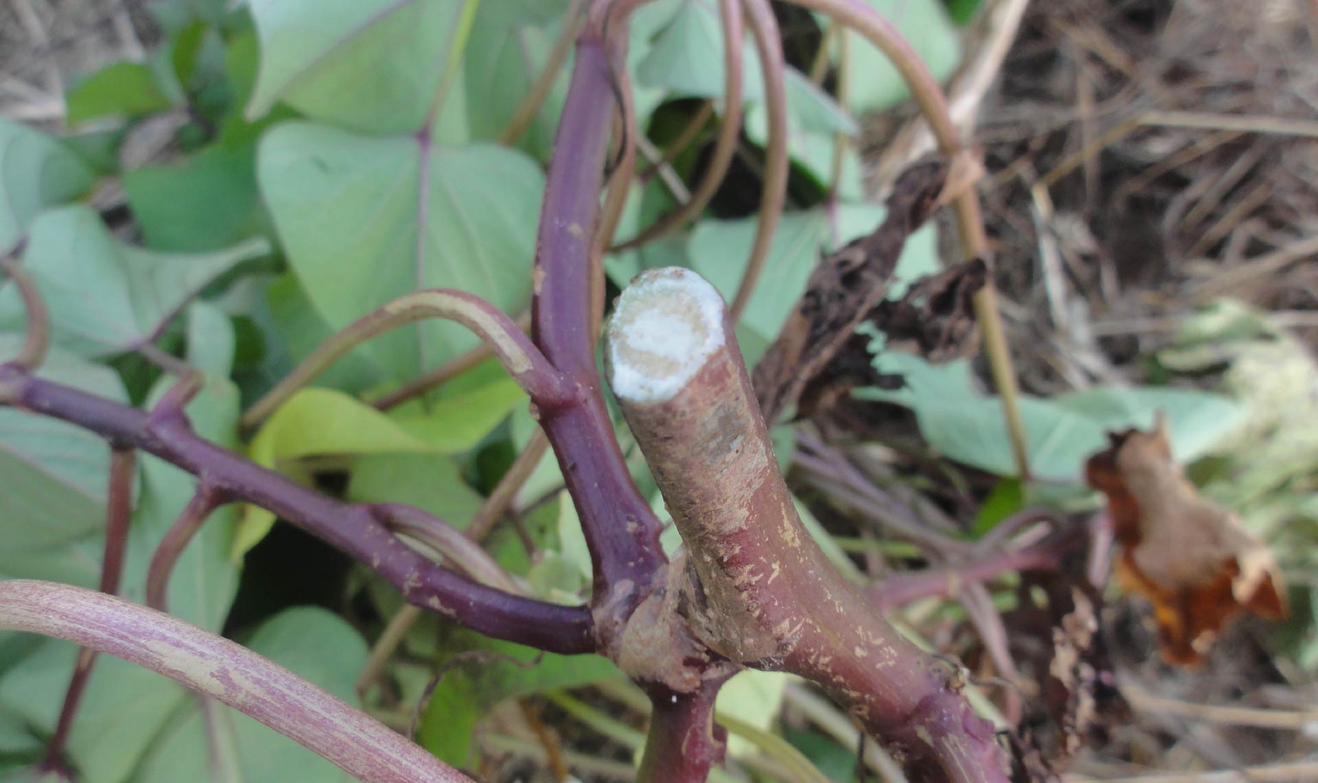 まずは、びっしりじゅうたんのように生えたツルを切っていきます。ツルだけでもかなりの重さがあります。このように、白い汁が出てきますが、これがヤラピンと呼ばれるデンプンのことで、空気に触れて乾燥すると、黒く変色します。簡単に言うと、サツマイモのデンプンが時間の経過や熱を加える(熱の加え方にもコツがあります)ことによって、糖分にかわり、甘さが引き出されます。