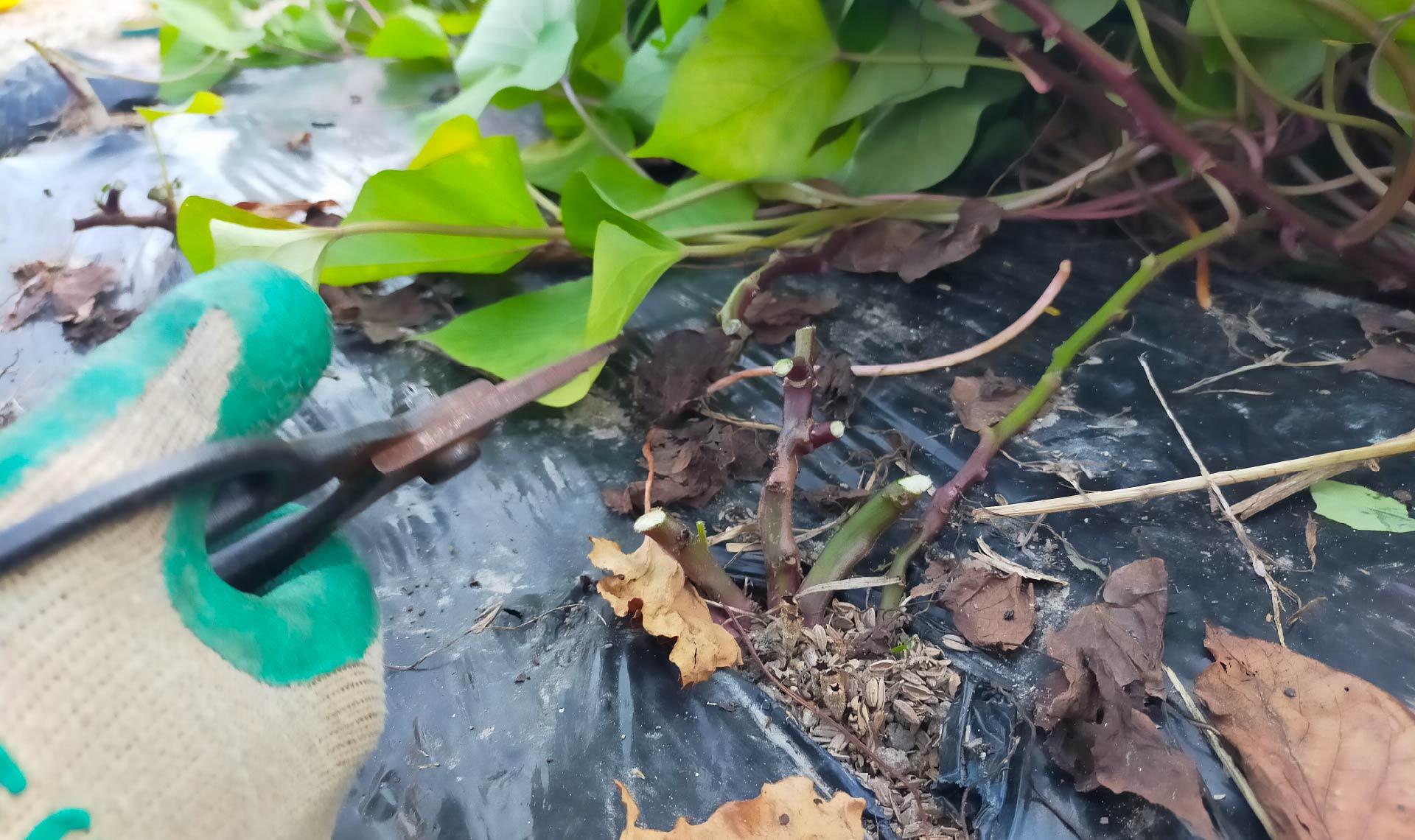 今年は、焼き芋やスイーツに加工した際に特に甘味を感じる、べにはるか、シルクスイート、安納芋の苗を定植しました。
