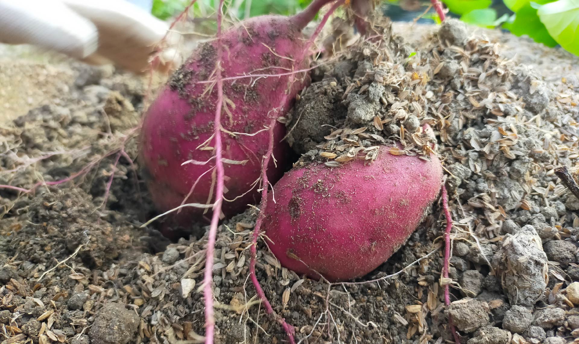 水分過多になりやすい土壌(田んぼの土を使用、畝の高さを確保できず水はけが悪かった)では、サツマイモが大きいサイズでした。逆に畝の高さを確保できて、水はけが良い乾燥した土壌では、中サイズのイモが適度に収穫できました。大きいイモは、ふかし芋や天ぷら、味噌汁用にはよい大きさですが、焼き芋にできるサイズが人気なので、来年は水はけをよくするために籾殻を投入して土壌改良し、畝の高さ・畝間をきちんと確保し、中サイズがたくさん収穫できるようにやっていきたいです。