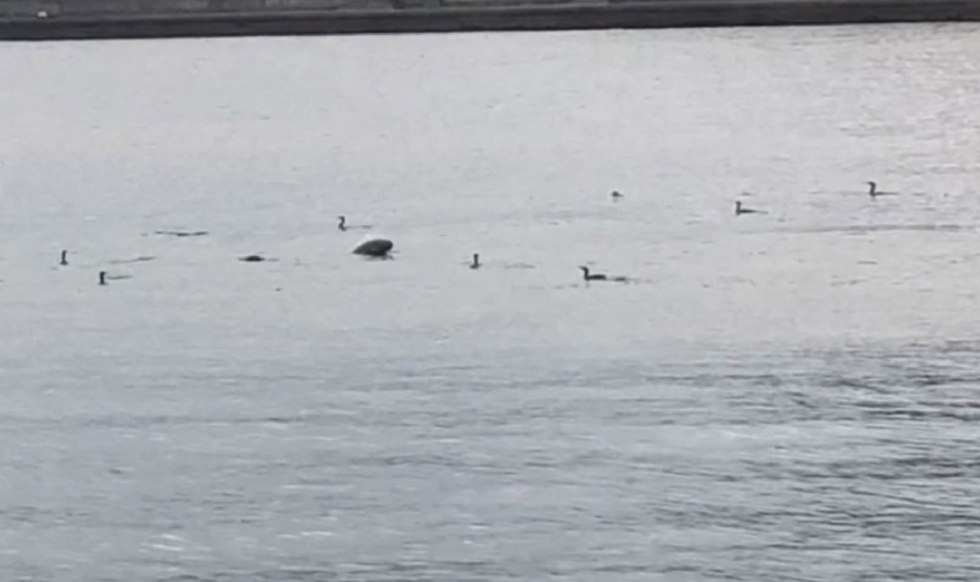近くにいた地元の釣り人に話を聞くと、たまに近くまでやってくるそうです。ちなみに、スナメリが現れると魚が釣れなくなるそうです(笑)