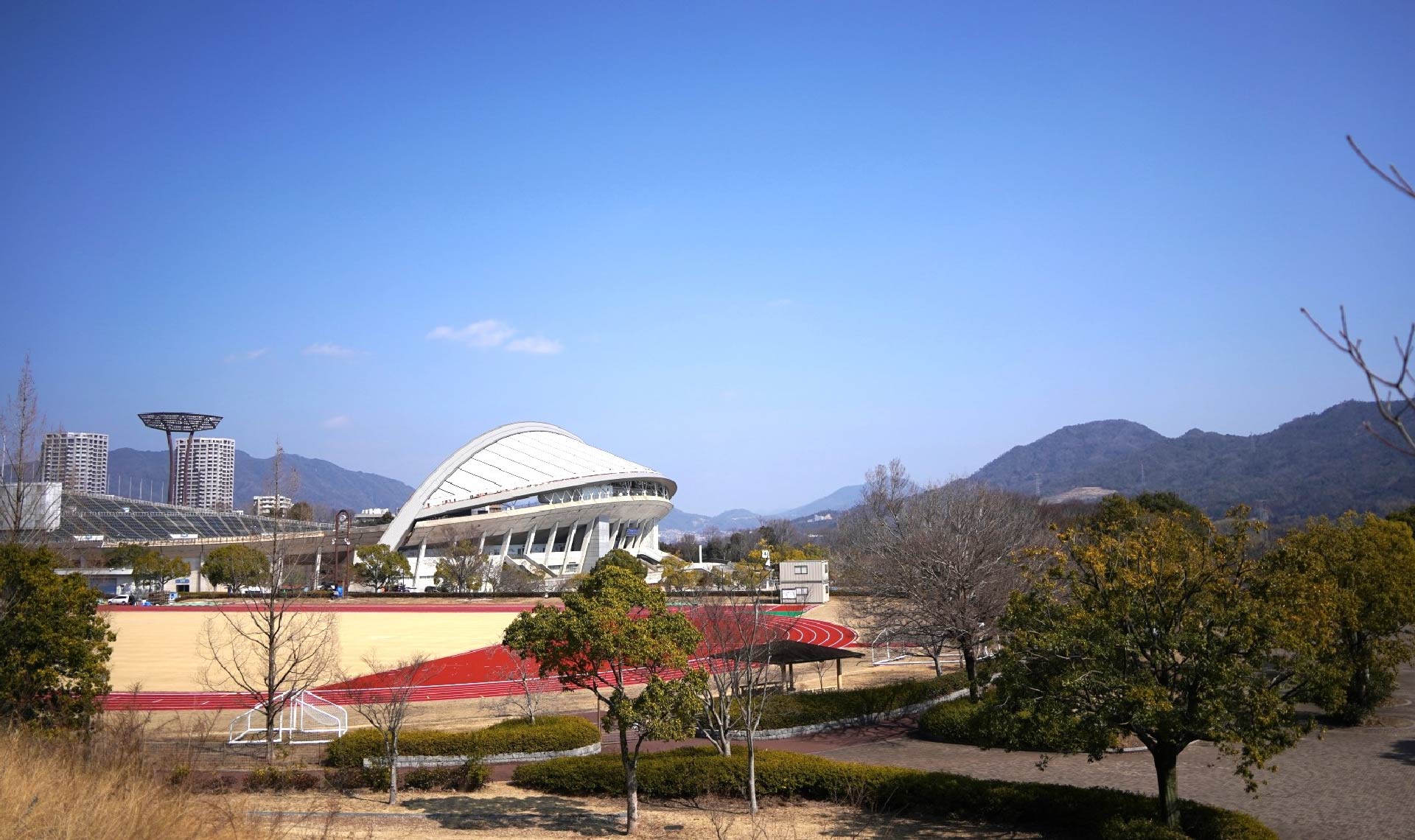安佐南区にある「広島広域公園」。エディオンスタジアム広島やテニスコートなどがある広大な公園です。アスファルトや芝生などの地面で練習でき、アップダウンのある道を走行練習したい場合にもオススメ。