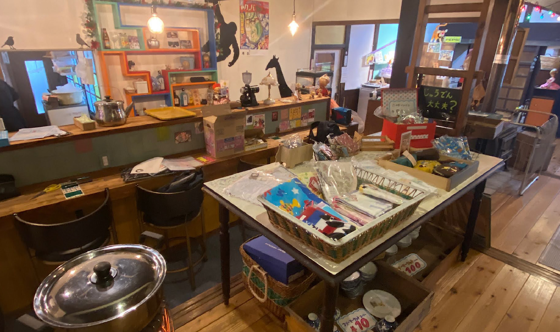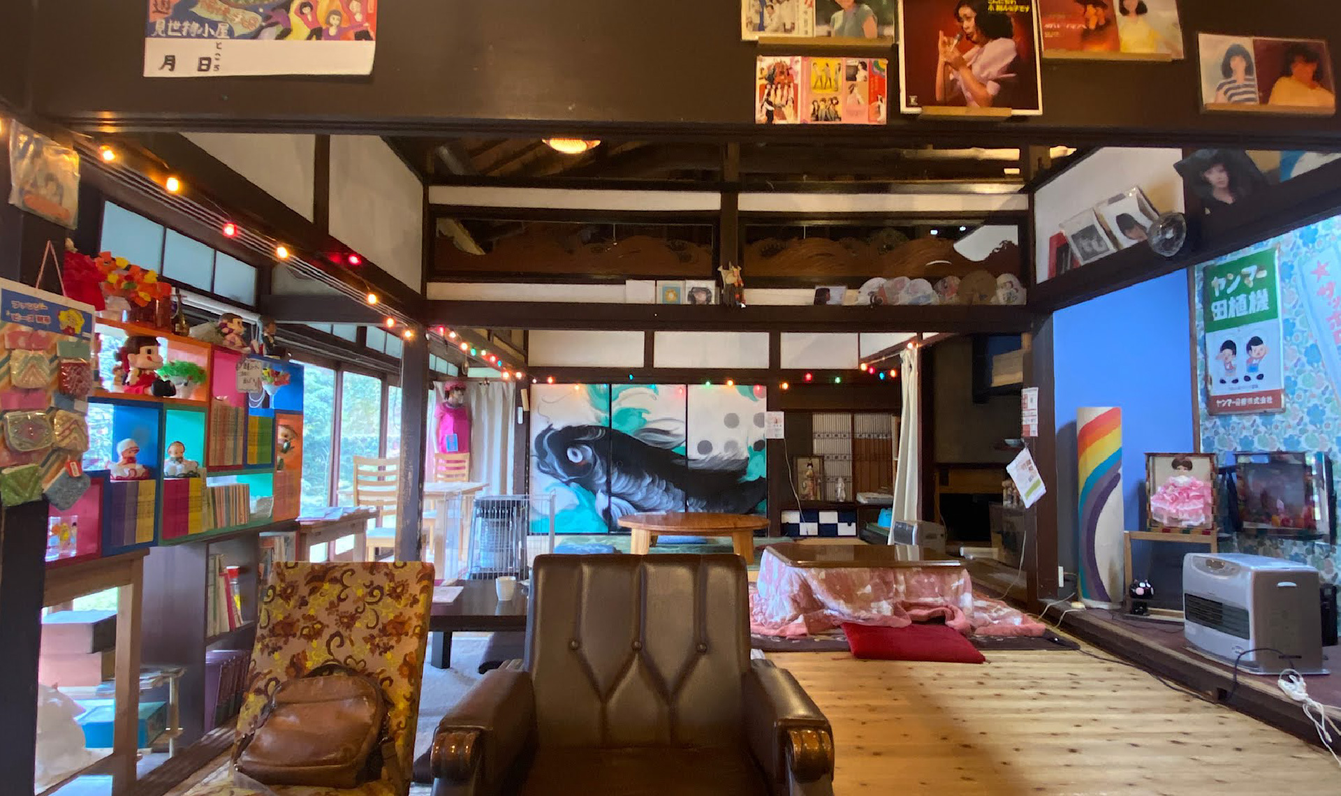 築110年の古民家をリフォームした建物はノスタルジックでどこか田舎の親戚のおうちを訪れたような懐かしさにあふれています。襖の大きな鯉の絵や色とりどりの電飾、自由に読める読書コーナーの「サザエさん」など心安らぐアイテムがいっぱい。肌寒い季節には、薪ストーブのやわらかい暖かさも心に沁みます。