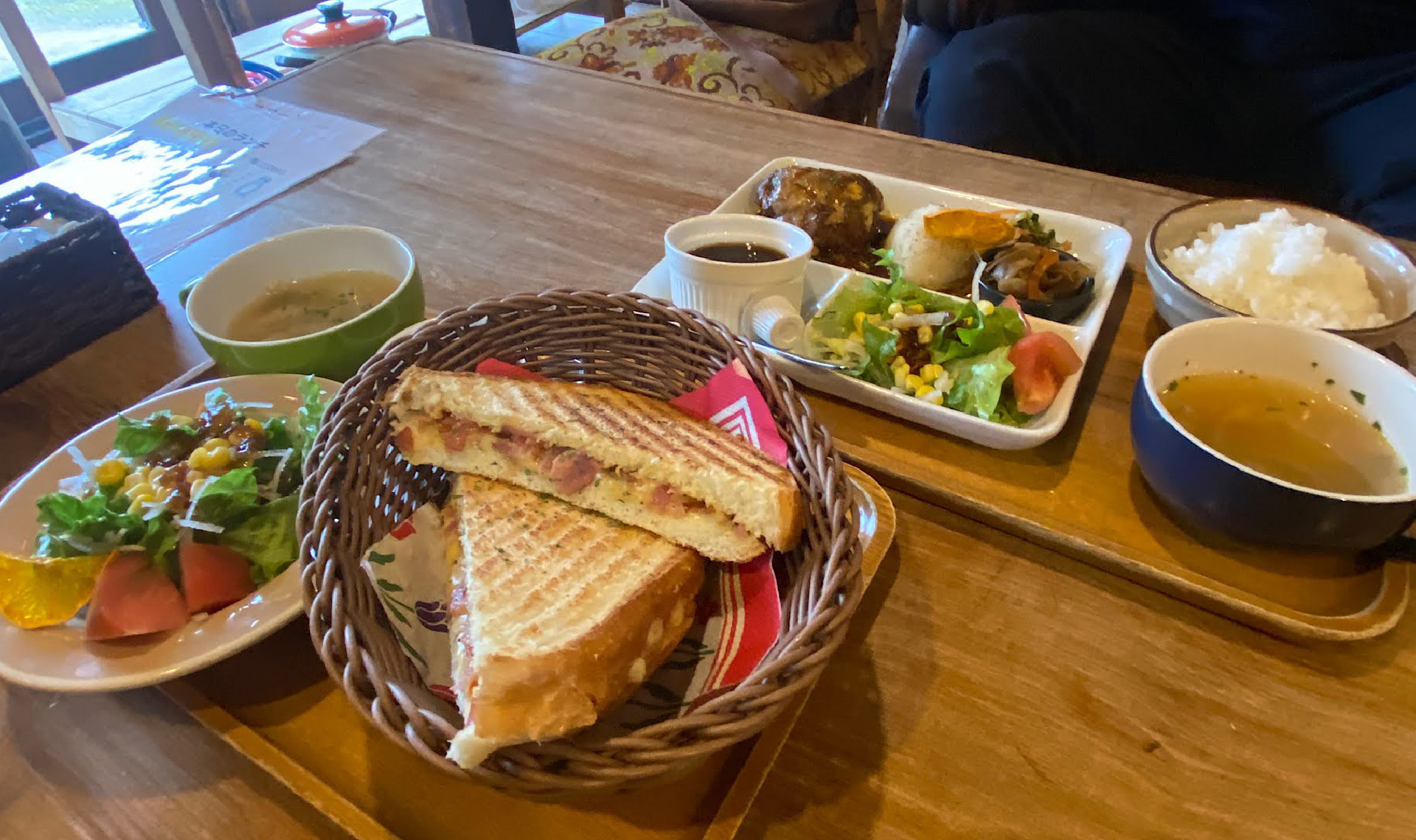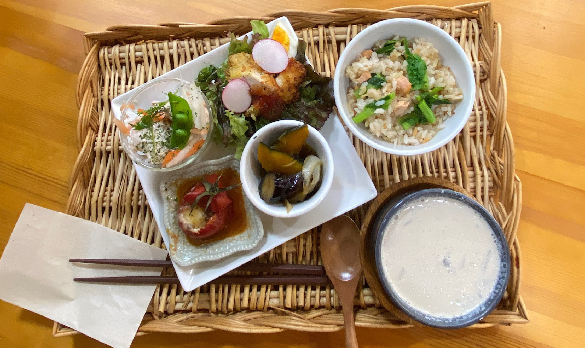 写真は、「しあわせデジュネ」。地元産のお野菜をふんだんに使ったシェフおススメのワンプレートランチです。この日のスープは「マイタケのクリームスープ」か「芽キャベツとソーセージのトマトスープ」から選べました。主食も「自家製パン」か「サーモンと菜の花のまぜごはん」からの選択が可能。筆者は「まぜごはん」を選びましたが、菜の花のほろ苦さがサーモンとマッチして、春をぱくぱく食べている感じ。とっても満たされた気持ちになりました。