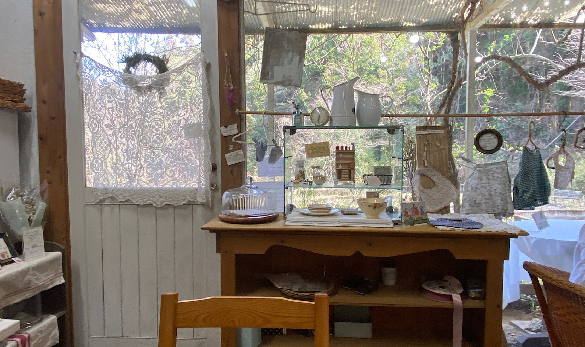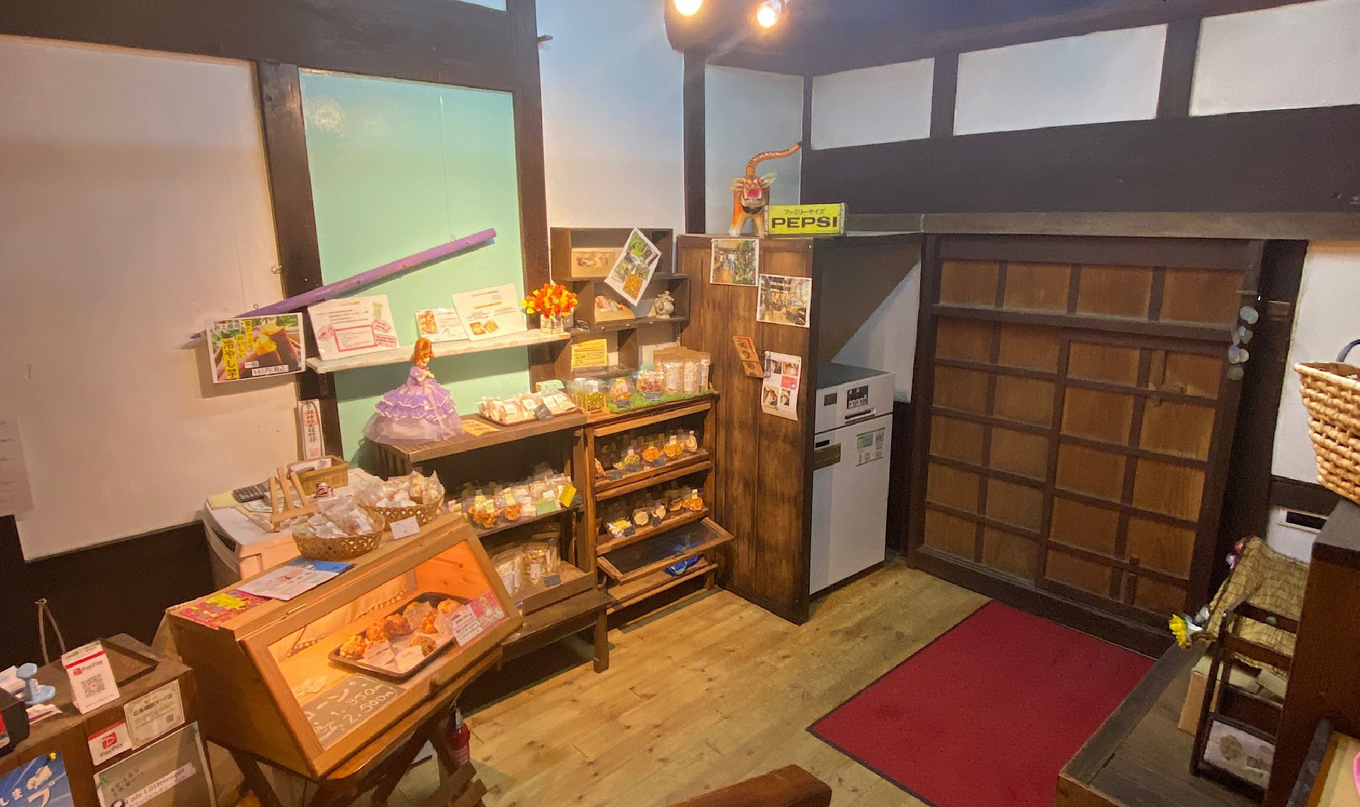 古民家の入り口、かつては土間であったと思われる場所に木のショーケースを設置して、ドライフルーツや手作りスコーンの販売もありました。