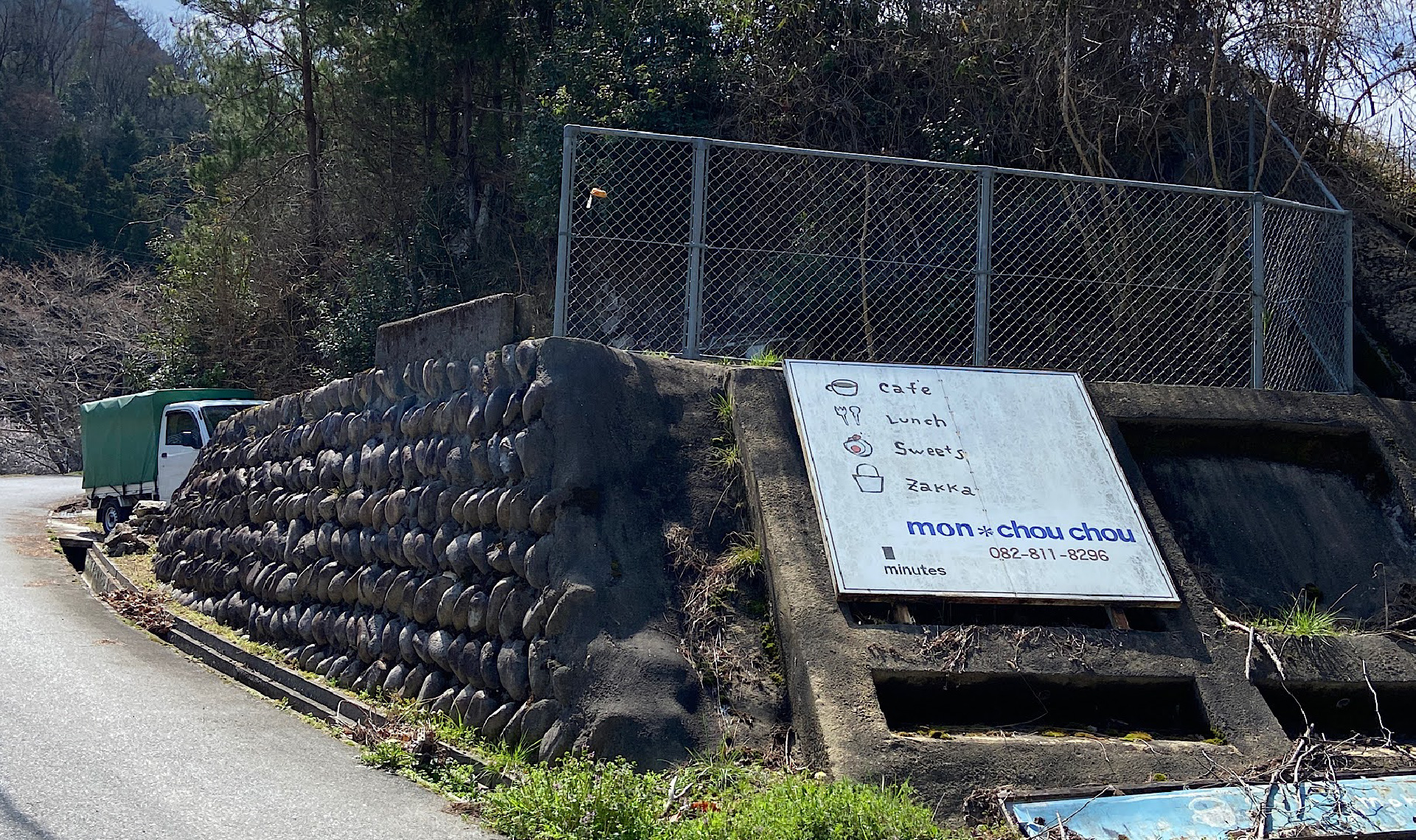2軒目の「カフェ モンシュシュ」は安佐南区の西風新都エリアから、さらに県道71号線で湯来方面へ向かう途中にあります。郊外へのドライブがてら立ち寄るのにぴったりですね。アストラムライン「大塚駅」から車で約13分。アストラムライン沿いの道から県道71号線に入り、奥畑エリアを目指しましょう。県道71号線沿いにこの看板がみえたら、左折です。