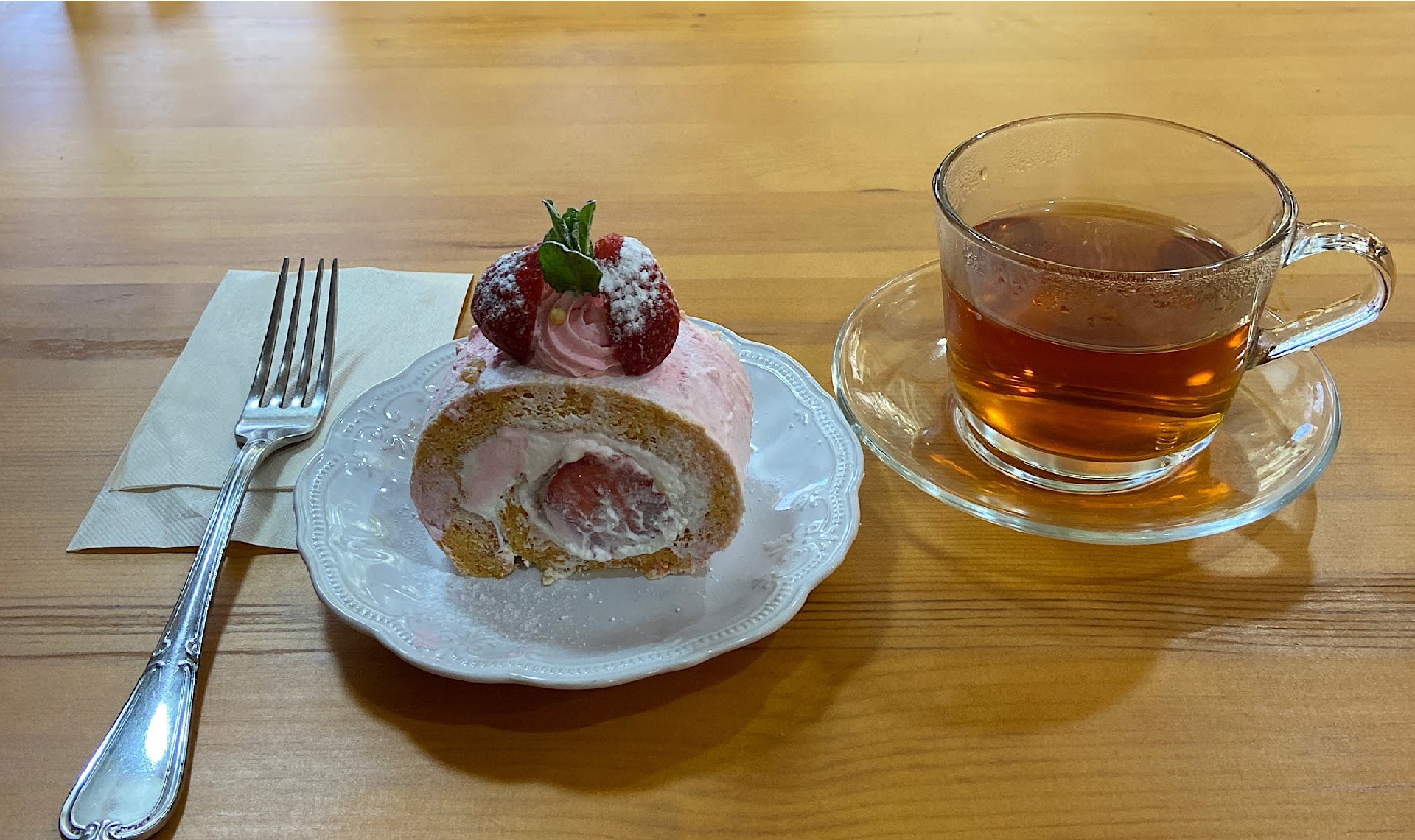 デザートのケーキ類もパフェも、すべてシェフの手作りですよ。この日のチョイスは「桜といちごのロールケーキ」。ていねいに手作りされた季節のケーキを有機茶葉で淹れたダージリンティーと一緒に頂きました。窓の外に広がる緑と、絶えずカフェの中に響いている井戸水が流れる水音にも、ほっこり癒されました。