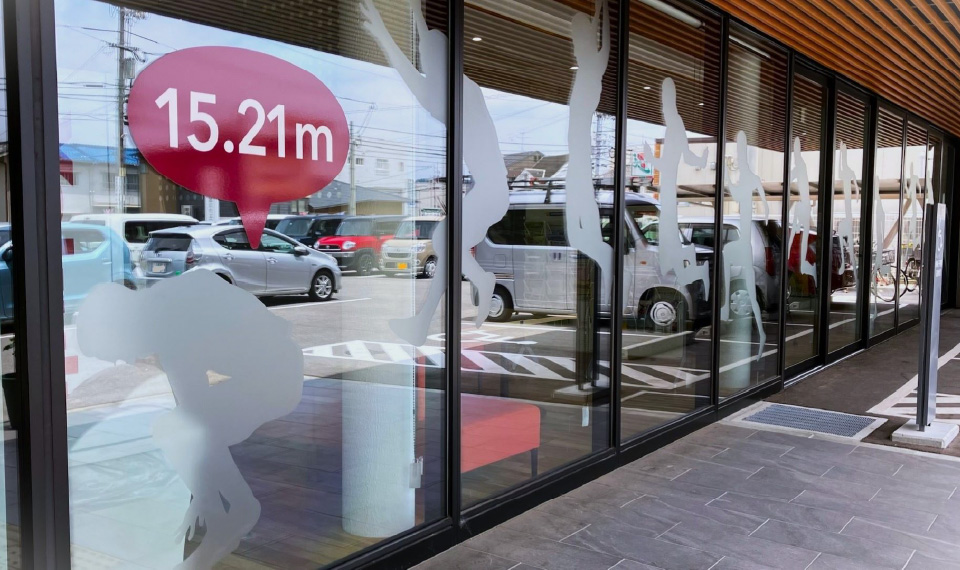 まず目を引くのが、織田幹雄スクエア入り口横にある跳躍イメージ。1928年アムステルダム五輪で金メダルを獲得したときの三段跳び15.21mの記録とともに描かれています。