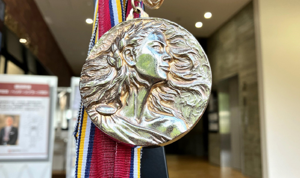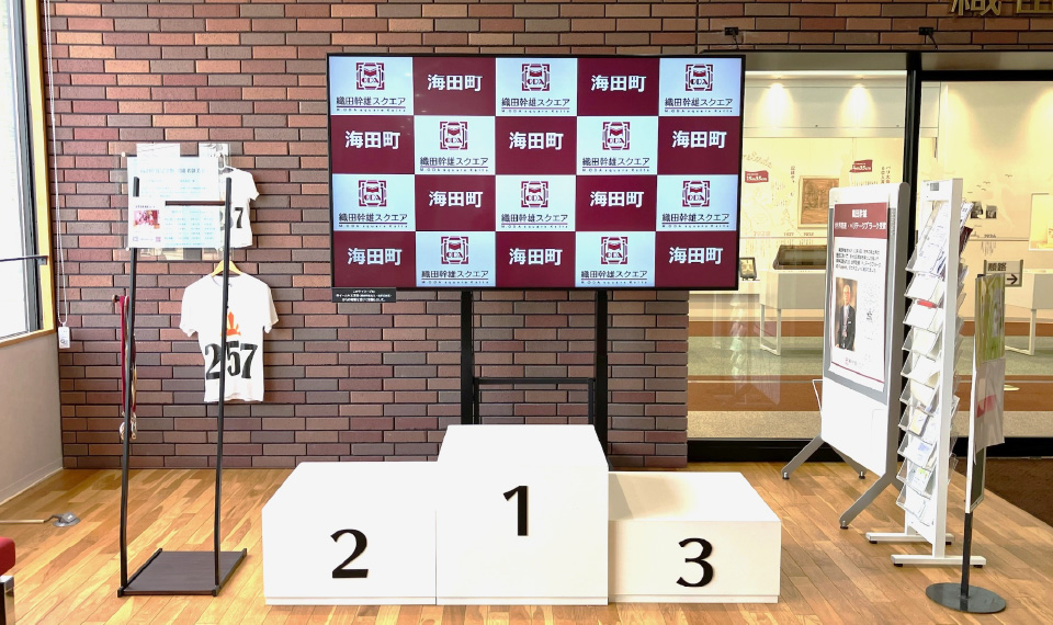 入口横にはフォトスポット。メダルを首からかけて、表彰台の上で記念撮影できます。表彰台やメダルに憧れる人は多いはず!なかなかできない体験が味わえるでしょう。
