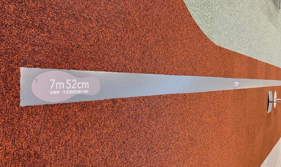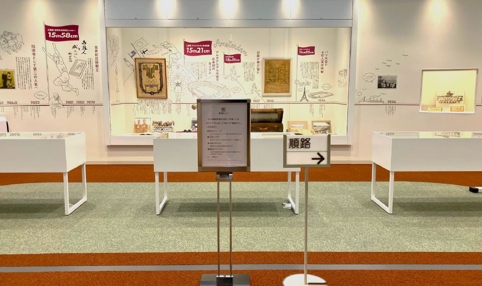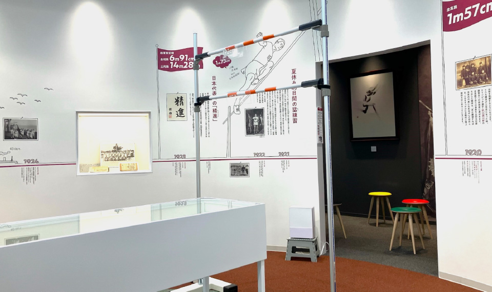 走り高跳びや走り幅跳びなどの競技でも活躍された織田幹雄さん。これらの記録も視覚的に体感できる展示になっています。