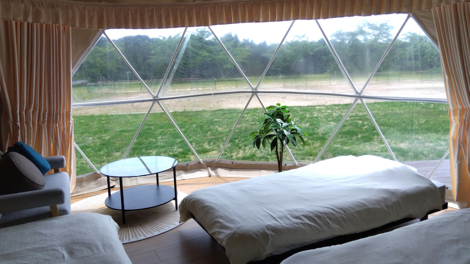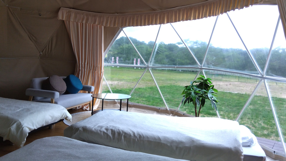 3棟のドームテントがあり、予約が埋まっていなければ、ソファの色でテントを選ぶこともできるよう。