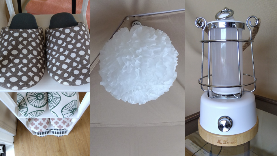 スリッパや天井につけられた電気、ランプなど、備品も北欧風のおしゃれなデザインが多く嬉しくなります。ほかに、ハンガーラックや姿見などもあるので、身支度や着ていた服の整理にも困りませんね。