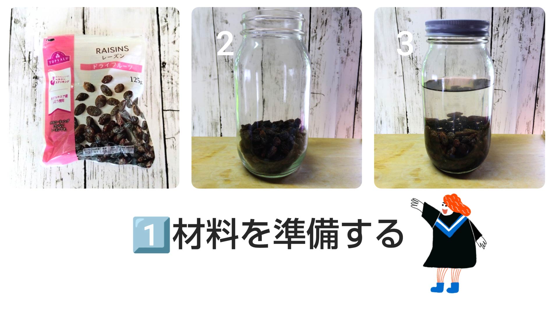 そこで今回は、市販されているレーズンを用い、レーズンにくっついた酵母菌の力を借りて、酵母液を起こしていきます。
