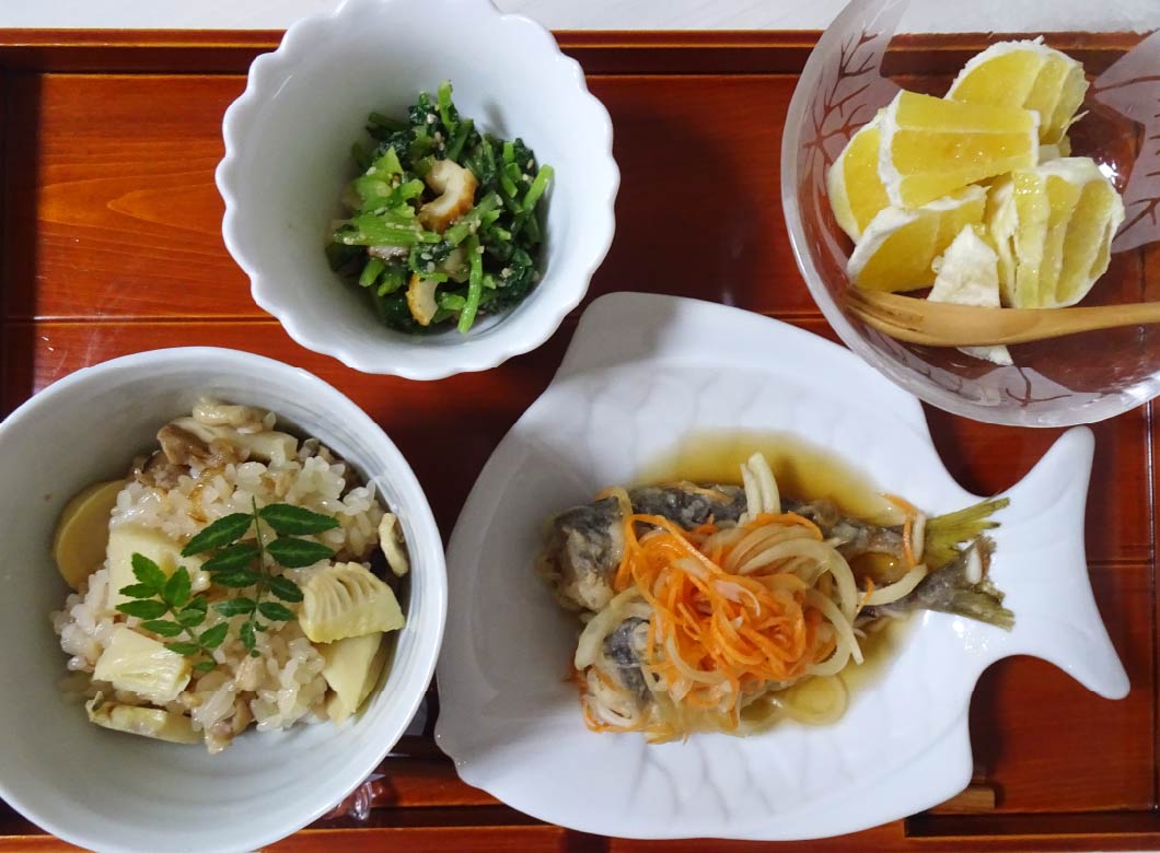 少し前までは春先になったら、春を感じさせる山菜や苺(今はクリスマスの頃を目指して栽培されているものが多いようです)を楽しみにしたものですが、夏のキュウリやナスなどの野菜も年中出回っています。現代の子供たちは旬とか、はしり(季節の初めの出初のものをいいます)とか言っても理解できないでしょう。また、流通が発達して何処でもいろいろなものが新鮮なうちに食べられます。私が子どもの頃、祖父母が青森に旅行に行ってりんごを送ってくれました。木のりんご箱に入ったりんごが硬くてとても美味しくて驚きました。普段口にするりんごは軟らかいものしかありませんでした。でもいつでも、どこでも同じようなものしか食べられないのも逆にがっかりしませんか?今回は少しでも季節を感じられる献立で、簡単に作れるものを考えました。