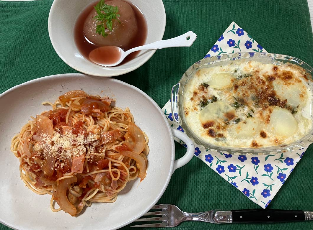 ムーミンのお話の中では生クリームのスパゲティですが、グラタンにも生クリームを使うので生クリームをトマトの角切りに変えて赤いスパゲティにしてしまいました。