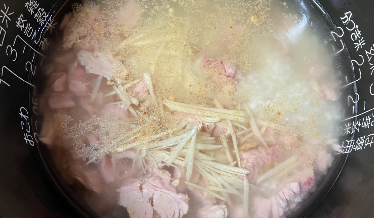 米は洗って分量の水(米の重量の1.5倍)に30分以上吸水させます。調味料は先に入れてしまうと吸水を邪魔してしまうので、調味料は炊く直前に入れます。