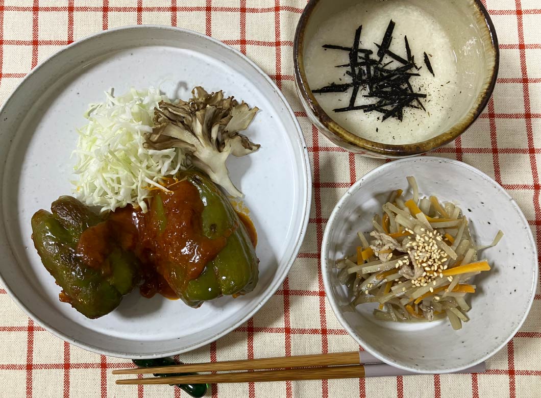 ピーマンの肉詰めは、本来なら玉ねぎを炒めたり、挽肉の中へつなぎに卵を加えたりしますが、できるだけ簡単に作ってみようと思って省略しました。ピーマンの大きさによって、材料は加減してください。