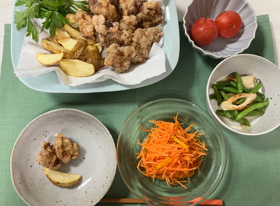 子供たちの大好きなから揚げとフライドポテトです。どうしても高カロリーになりますので、できるだけ衣は振り落として薄くします。