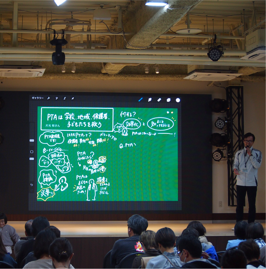 2回目の2019年はさらにブラッシュアップさせて、「みんなでつくる未来の学校」というテーマを設定し、事前に発表したい方を募ってメンバーで選定。発表を聞いて思ったことを観覧者がリアルイムでスマホに書き込んで共有できる仕組みや、発表と逆質疑応答のポイントを可視化する〝グラフィックレコーディング〟なども新たに採用しました。