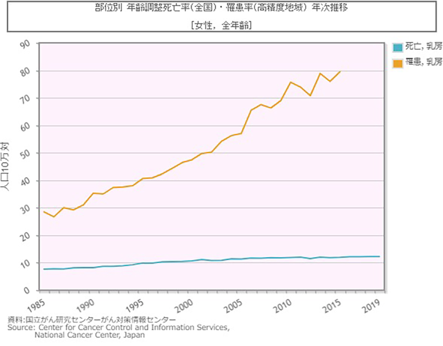 乳がんの死亡数・罹患数の推移。罹患数が増加していることがわかります