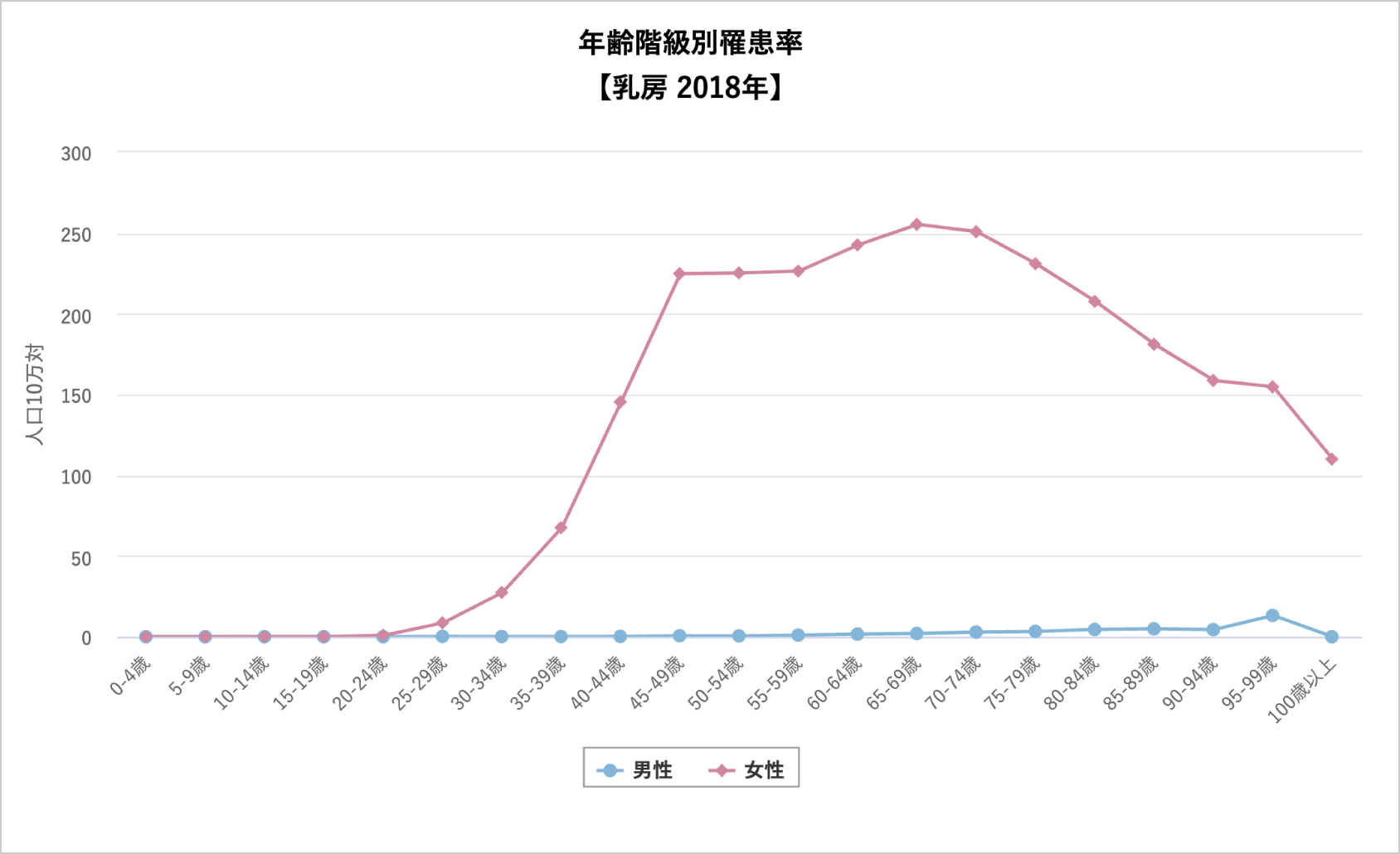 〈引用:乳房:[国立がん研究センター がん統計] 5.年次推移 - 年次推移について詳しく見る -2)年齢調整の罹患率と死亡率 より〉年代別でみると、2018年のデータでは、乳がんの罹患率は30代後半から増加し始め、40代後半まで上昇し、そのまま罹患率は下がらずに60代後半がピークになります。社会や家庭での責任・負担が多い年代です。自分のことは後回し、家族や組織のことを優先してしまいがちな頑張り屋さんの女性が多くいらっしゃる年代でもあります。一方、数は少ないものの20代で発症するケースもありますし、70代・80代でも乳がんを発症します。