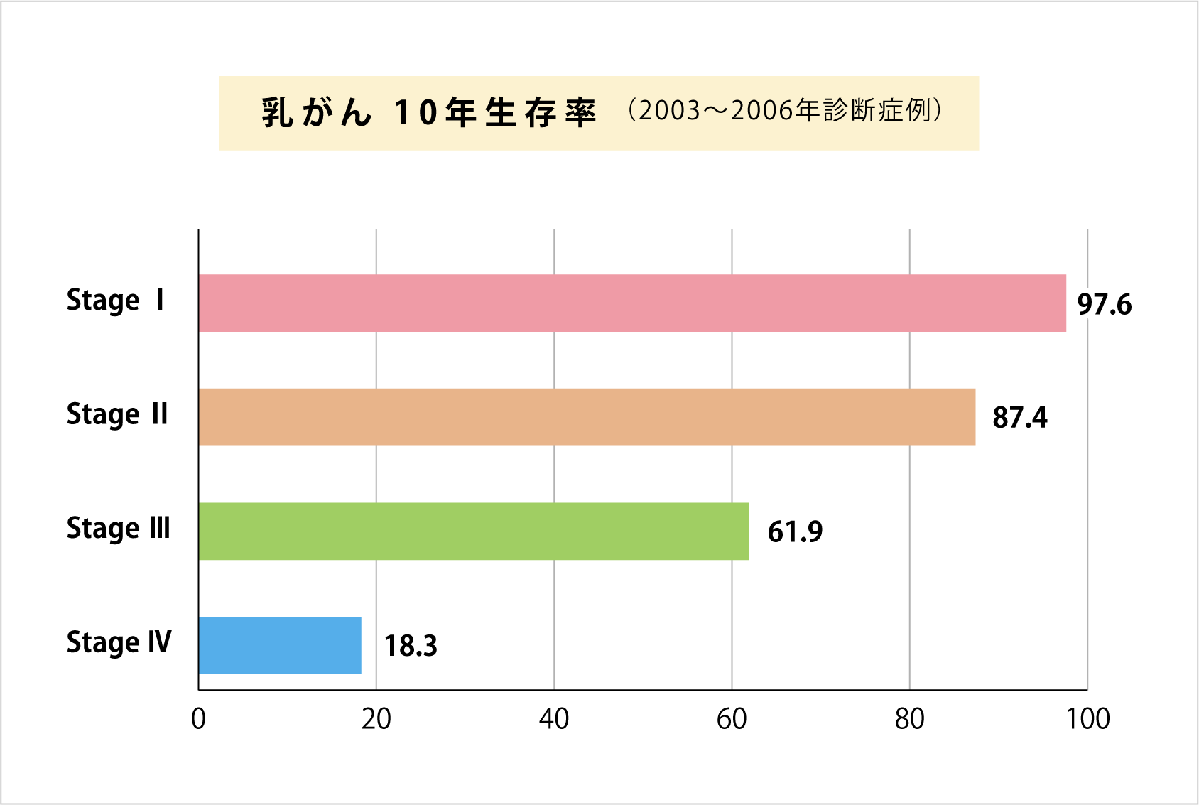 乳がんは、早期発見できれば生存率の高いがんです。比較的早く見つかったステージ0・ステージ1の場合、10年生存率は約90%以上。全症例でも10年生存率の平均は約80%ですが、ステージが進むと10年生存率は悪化していくため、早期発見がとても重要です。