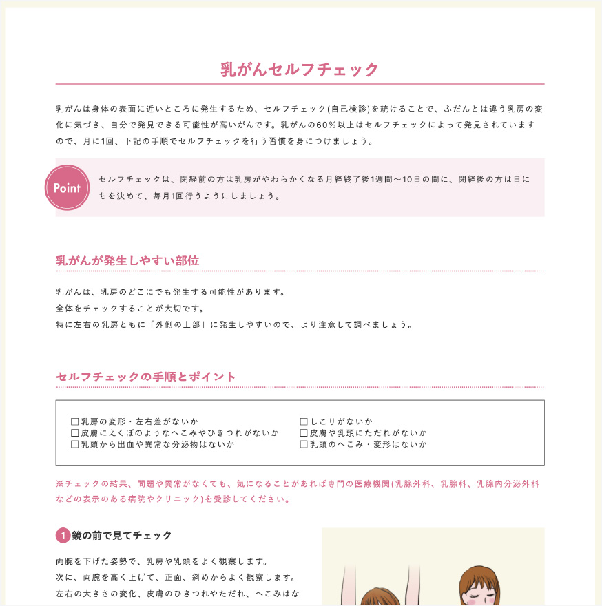 また加えて行っていただきたいのが、セルフチェック。呉医療センター・中国がんセンター 乳腺外科の木村優里先生が、このFamily Dr.の中にわかりやすいページを設けてくださっていますので、参考にしてぜひ月に一回の習慣にしてください。