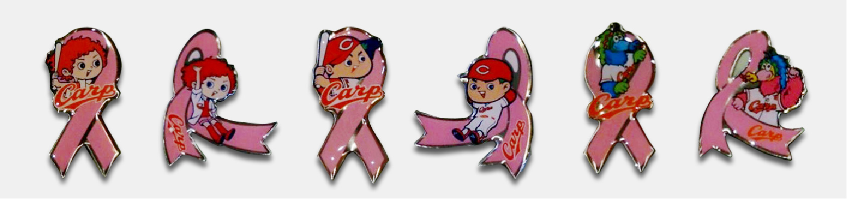カープピンクリボンバッジ。網岡さんが製作に携わったカープ坊やとカープ女の子の4種に、