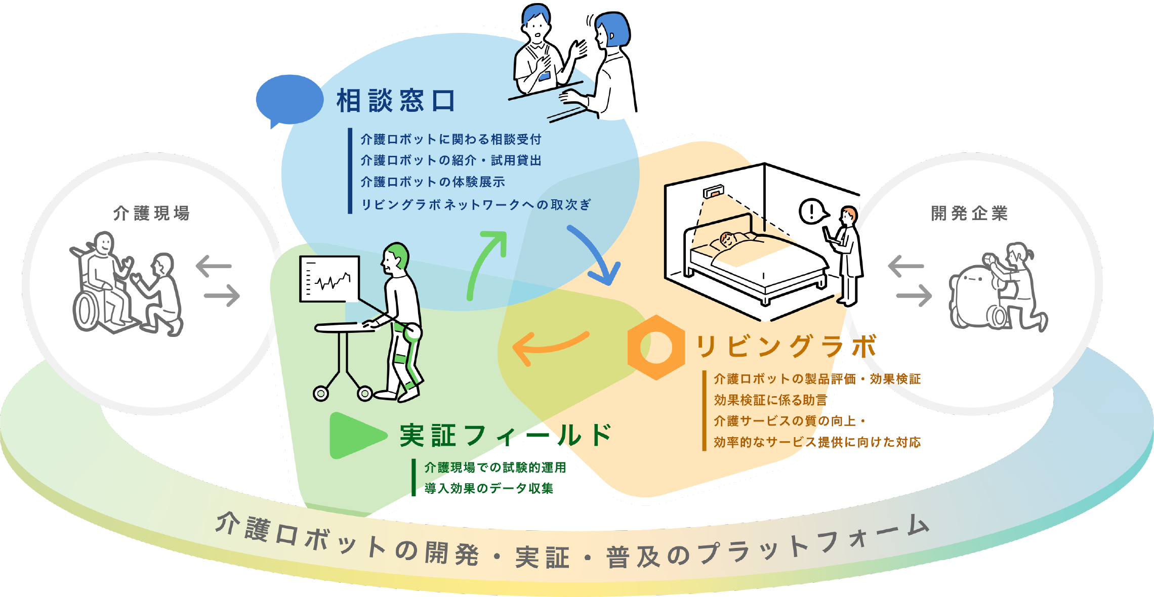 もう一つ重要な役割と考えているのが、介護現場の声をロボットの開発現場に上げることです。製品開発の現場では、技術という“シーズ”が元になって研究が進められることが多い。けれども必要とされている“ニーズ”に合っていなければ、使い勝手の悪いものになりがちです。介護現場の“ニーズ”を積極的に伝えて製品開発のヒントに役立ててもらうことはもちろん、貸し出した介護ロボットを現場で使ってみた上での意見を集め、ブラッシュアップにつなげてもらう。