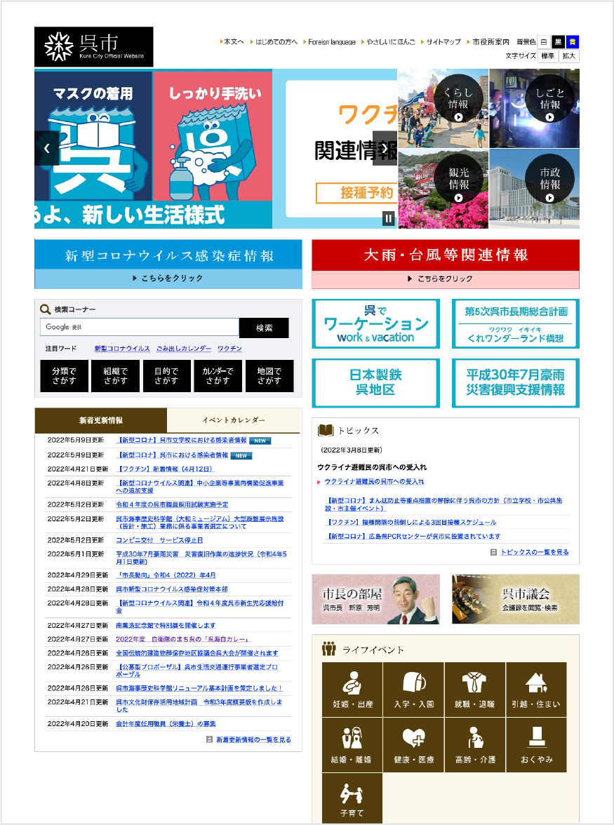 例えば、スマホで呉市のホームページを開いて下にスクロールすると、「ライフイベント」のバナーが並んでいます。その「妊娠・出産」をタッチすると、「くれ妊娠ほっとライン」「プレママほっとタイム」など、必要な情報にすぐにアクセスできるように工夫しました。さらに児童手当や乳幼児等医療費助成、保育所入所の手続きなどを、子どもさんのお昼寝中などにスマホの操作だけで行えるようにしました。それらをわかりやすく案内する「子育て手続きナビ」や、子育て中の保護者をサポートするアプリ「くれっこアプリ」なども整えて、安心して子育てできる環境づくりに努めています。