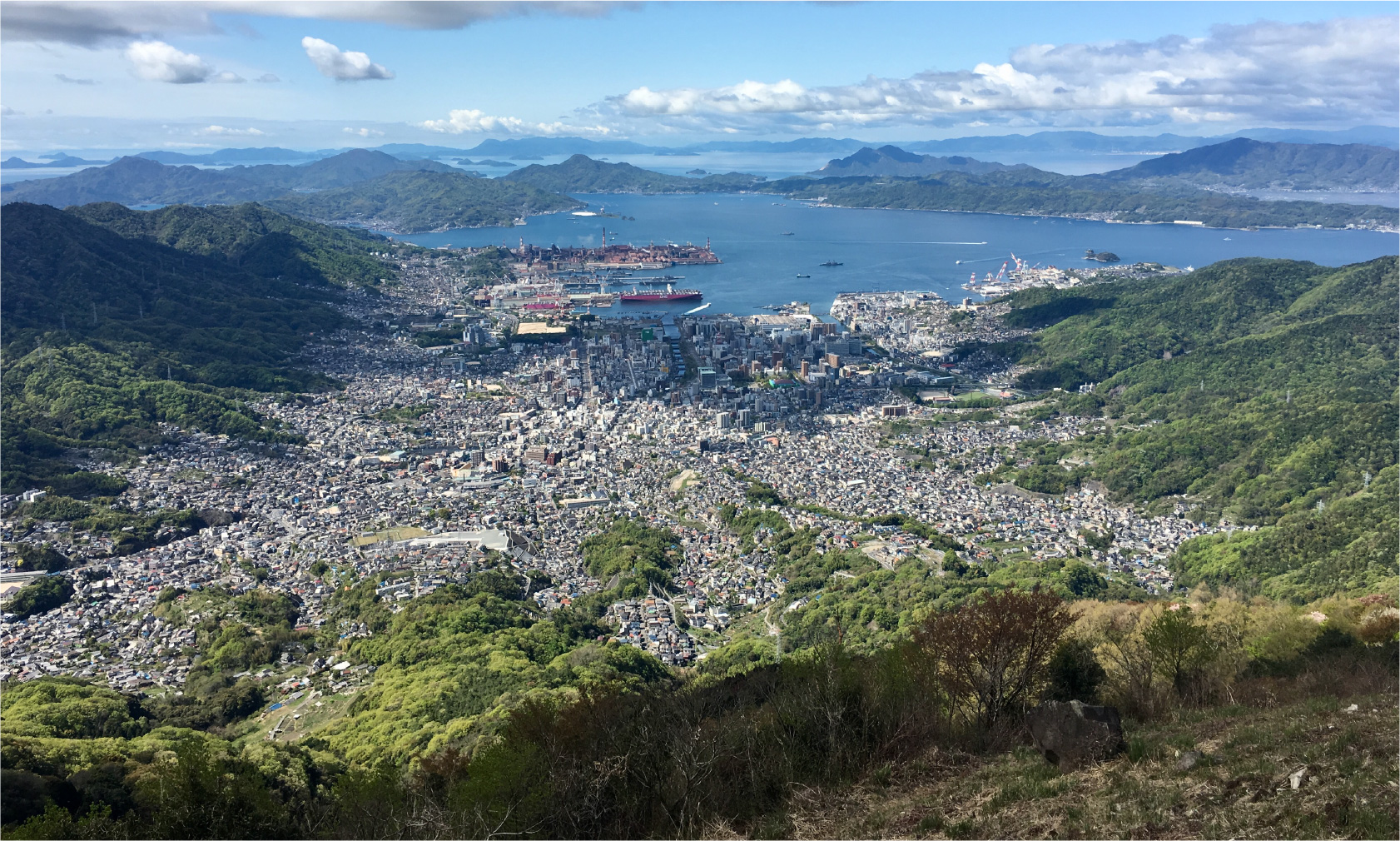 灰ヶ峰からの呉市街、呉市章のモチーフとなっている九つの峰で囲まれているのが良く分かる