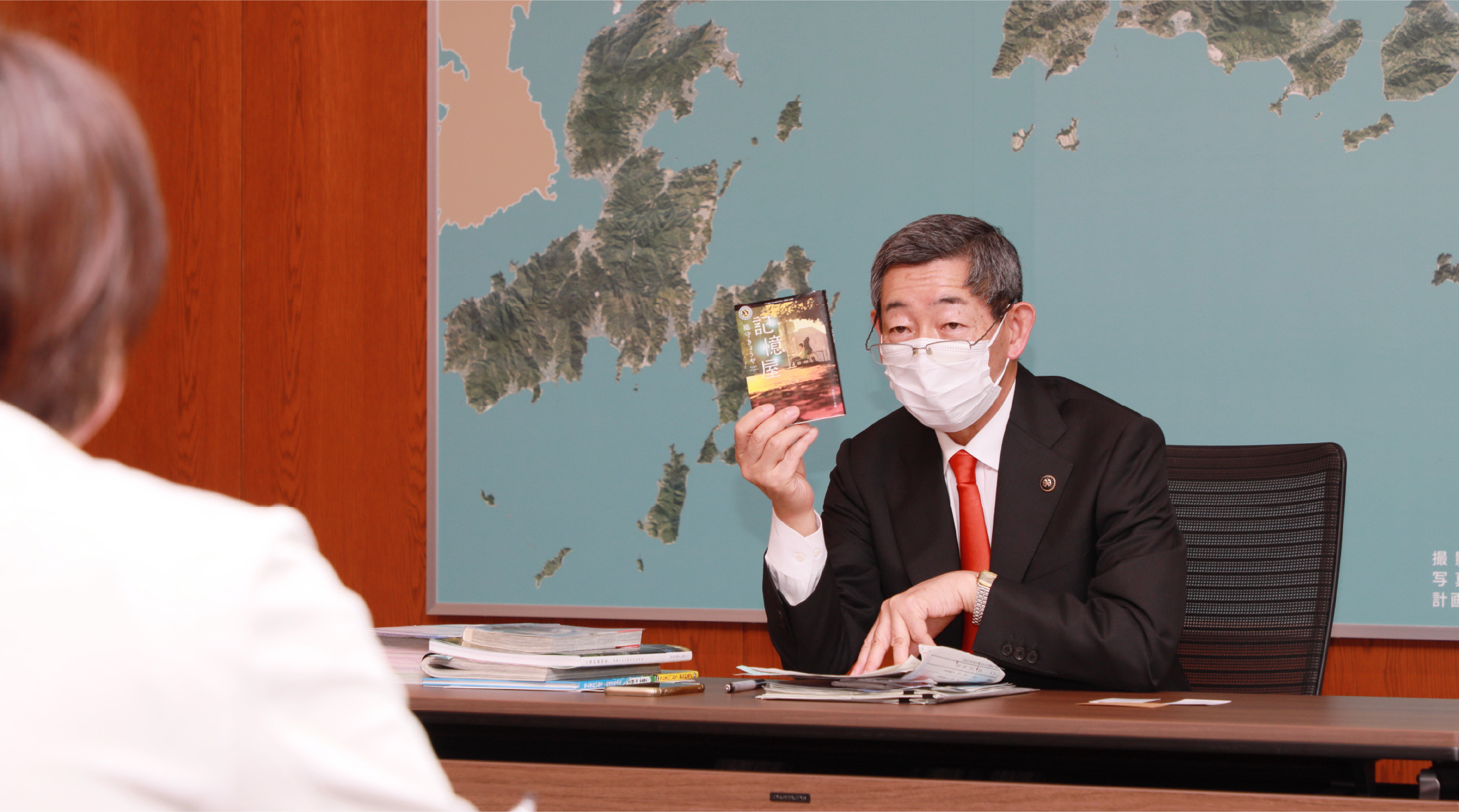 たくさん用意してくださった資料の中から、呉市でロケが行われた映画『記憶屋 あなたを忘れない』の原作本を手に取って、呉市の魅力を語る新原市長