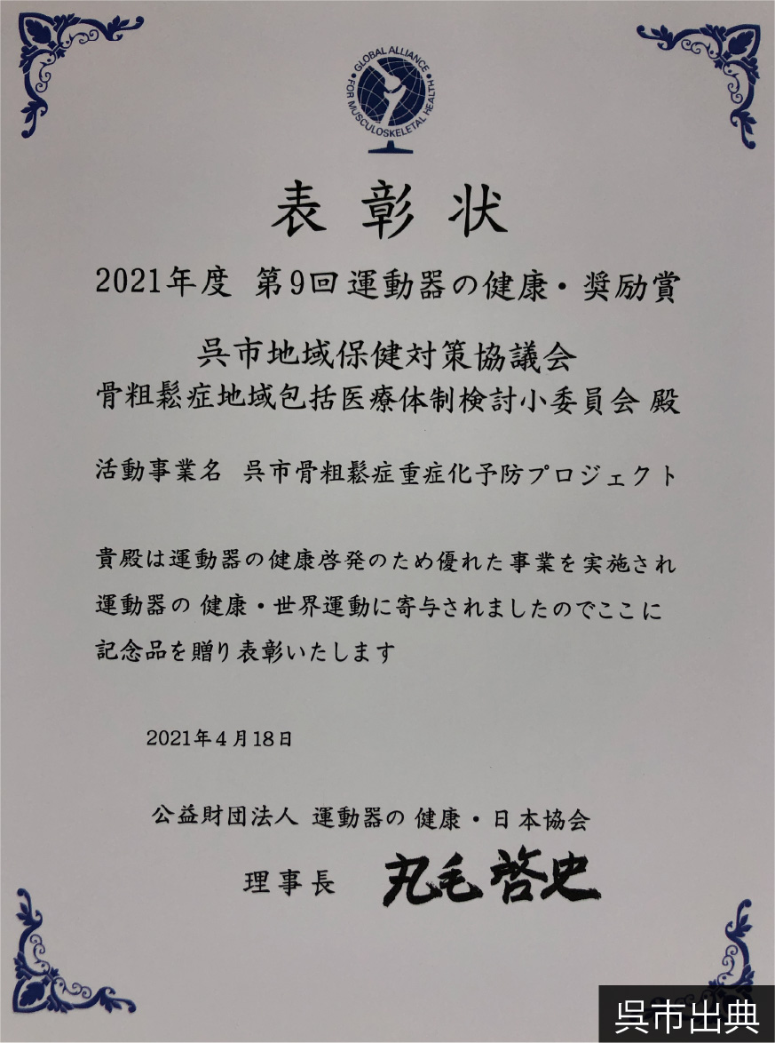 医師会、歯科医師会、薬剤師会と、呉市の福祉関連機関との連携が優れていることも特長で、一緒に勉強会を開いたりしながら、地域の医療・福祉の充実に取り組んできた実績は呉市の誇れる点です。地域包括支援という考えが一般的になる前から、官民が一体となって医療と介護を一緒に考えてきましたし、糖尿病性腎症重症化予防が呉市モデルとして注目されています。2021年には、呉市と医師会、歯科医師会、薬剤師会の4者が連携して骨粗しょう症の重症化を防ぐ取り組みが、公益財団法人「運動器の健康・日本協会」が選ぶ、「運動器の健康・日本賞」の奨励賞を受賞しました。
