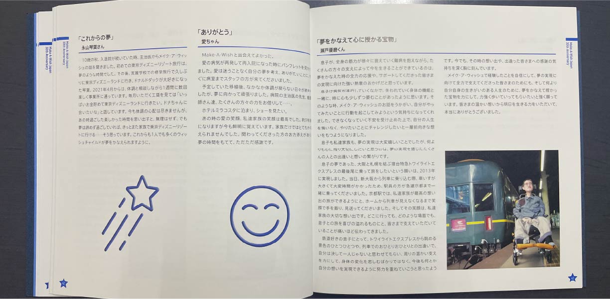 グッズや本のご購入によるご支援もあります。2022年はメイク・ア・ウィッシュ オブ ジャパンが30周年の節目を迎えるにあたり、クラウドファンディングにて資金を集め、夢がかなった子どもや家族のエピソードを集めた記念誌を発行することができました。