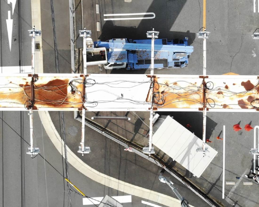 ドローンによる事前調査の活用は、修繕や点検を効率的に行う上での有効な選択肢の一つです。例えば、高所の異常確認も事前にドローンにて行えば、コストや道路使用許可申請を必要とする高所作業車の出動に至らずに済むケースもあり、異常があった場合でも本点検をせずとも効率的な改修を進めることができます。