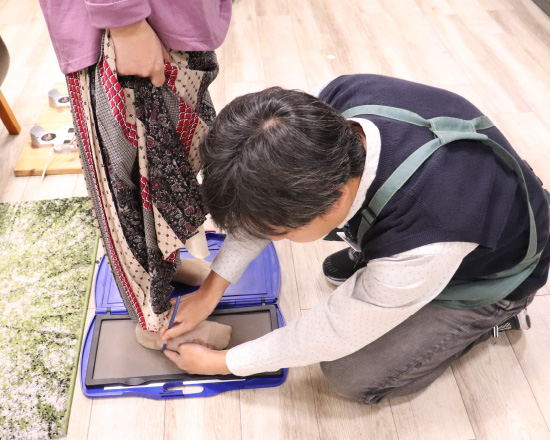 足の計測を体験。普段履いている靴のサイズより、実際の足は小さいことが多いようです