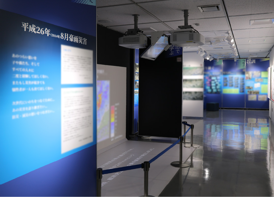 一つは、「平成26年8月豪雨災害」に何があったのかを伝えること。当時の土石流を再現したCG映像、被害の全容をまとめた地図や写真などの記録、そして被災者のインタビュー映像を通して、どのような災害であったかを知っていただきます。