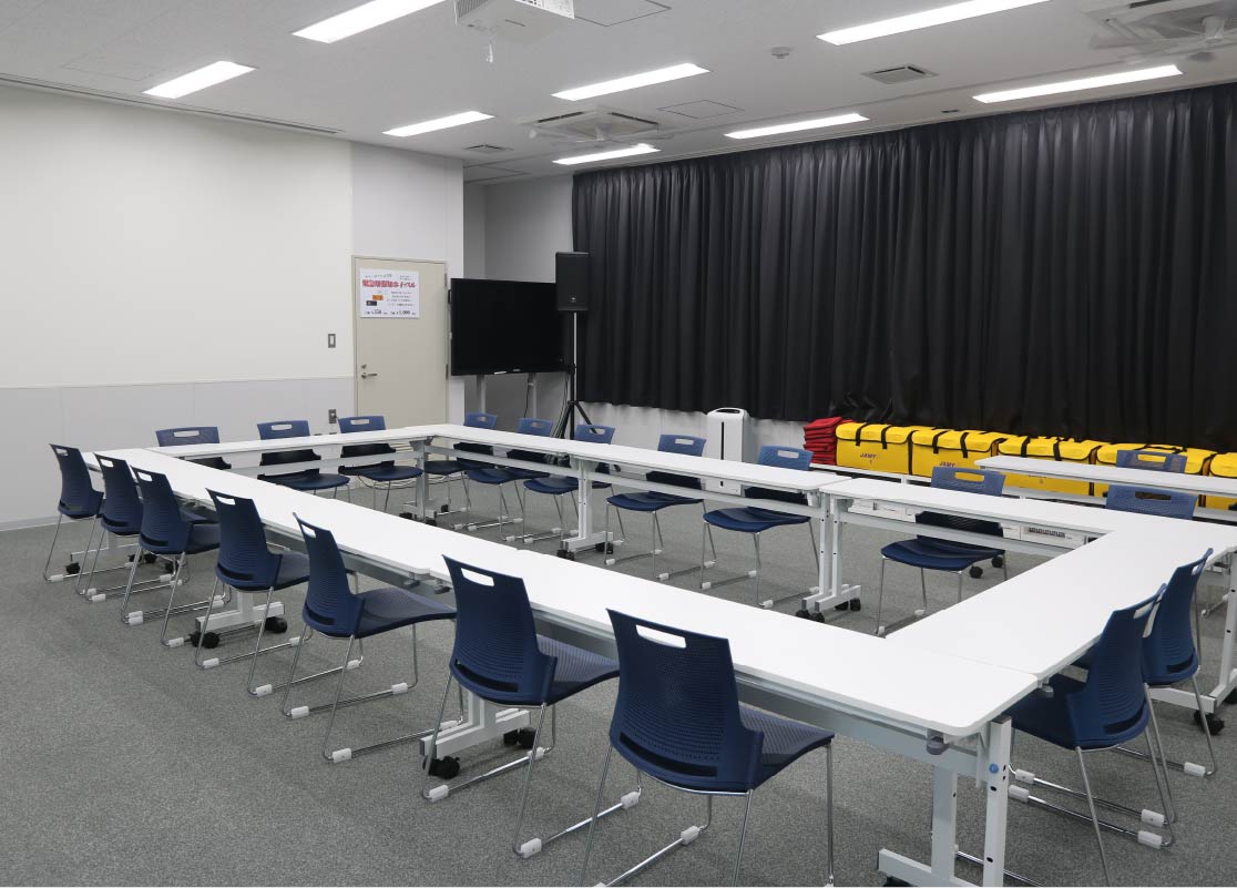 1階は様々なプログラムに対応する研修室。パーティションを外すと、最大120名まで収容可能