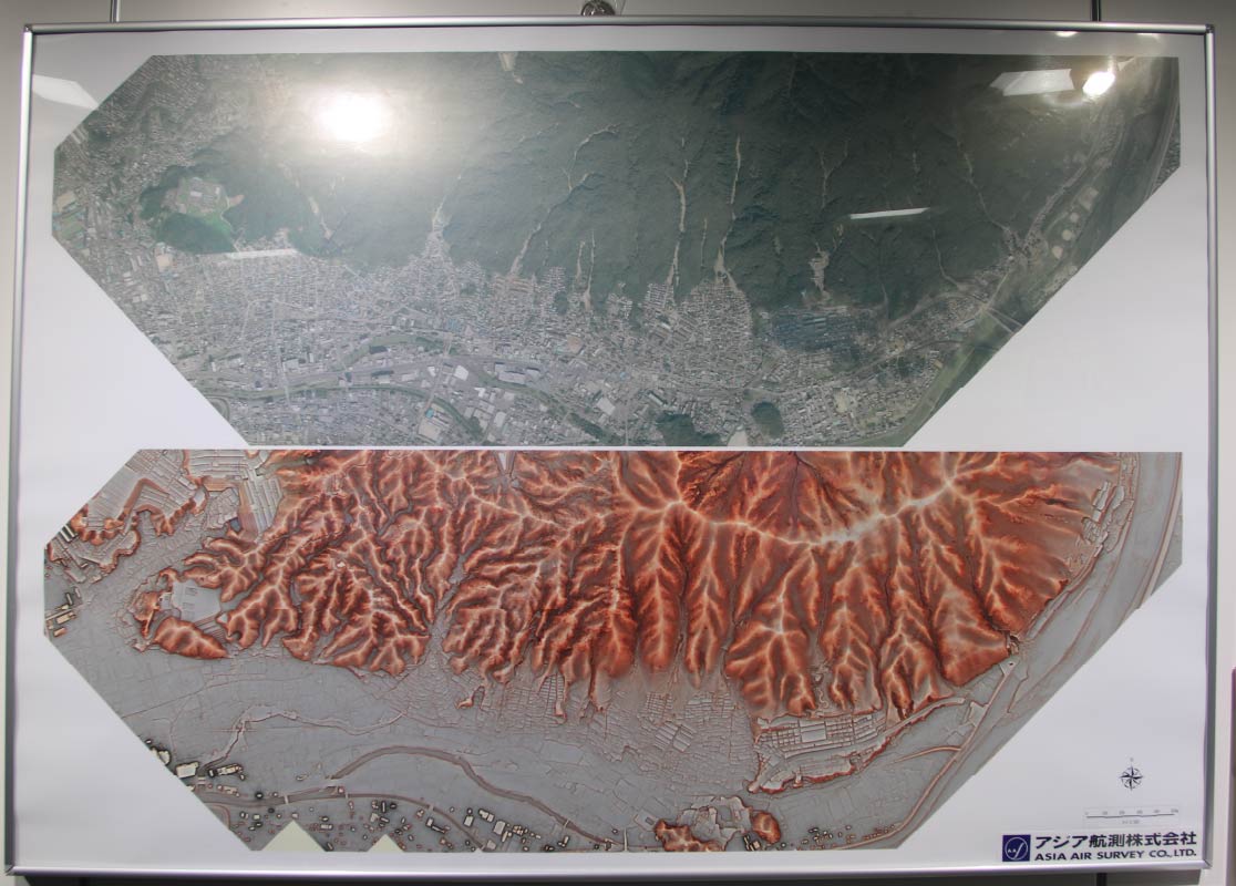 土砂災害時の航空写真と地形図。「蛇落地」と呼ばれるほど、蛇が這いずり回るように無数に谷筋が走る地形になっている
