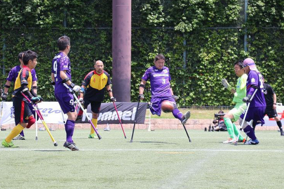 アンプティ(amputee)とは、「切断」のこと。フィールドプレーヤー6人は片脚に切断または麻痺等、ゴールキーパーは片腕に切断または麻痺等の障がいがある選手がつとめます。それぞれ、ボールを扱えるのは片脚または片腕だけ。フィールドプレーヤーはクラッチ(杖)で体を支えて移動したりボールを蹴ったりしますが、クラッチでボールに触れると「ハンド」の反則となります。