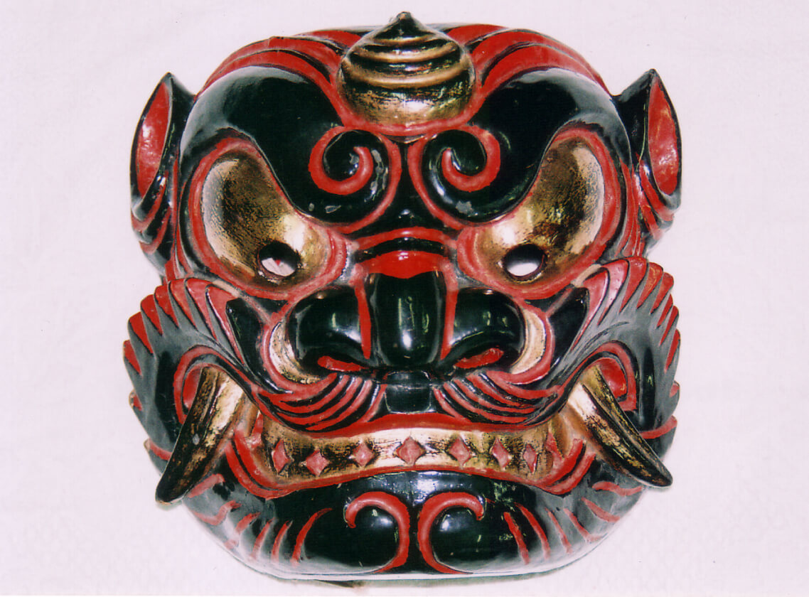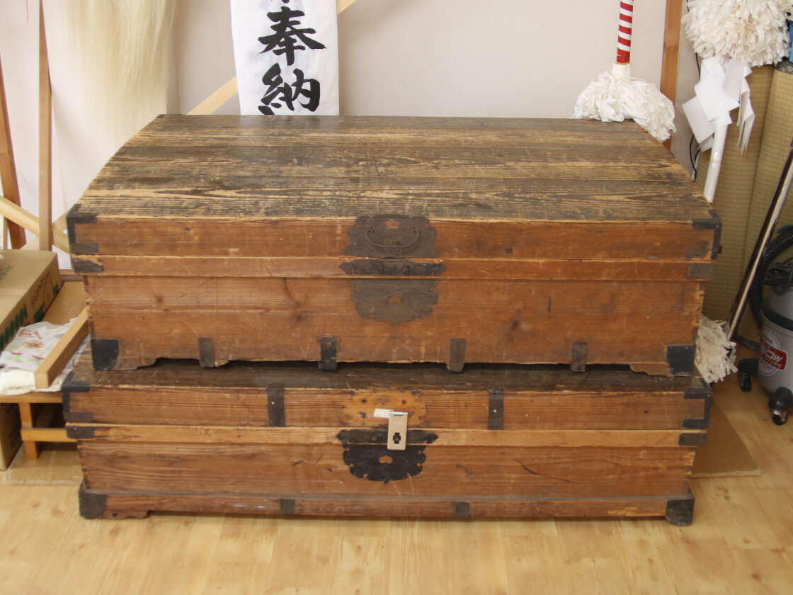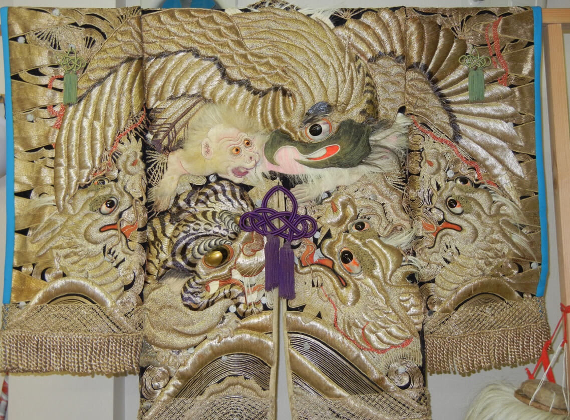 神楽と共に今日まで受け継がれたものに、十二神祇の代表的な舞である「関(せき)」の面と大羽織があります。「荒平(あらひら)」とも呼ばれる「関」は、鬼でありながら秋田のなまはげのような邪を払い福を授ける異形の来訪神で、各地でその姿も異なります。 岩谷に残されているのは、赤、黒、金で彩色された木彫りの面と、背面に金糸銀糸をふんだんに用いて龍、虎、鷲と狒々(ひひ)を縫い込んだ大羽織。羽織は大正2年(1913年)に10円で製作されたと衣装櫃に記されており、今では技術的にも金額的にも再現が難しい貴重なものです。神楽の大会などに参加すると、他の団体の方からも「これは、すごいですね」と感嘆されます。