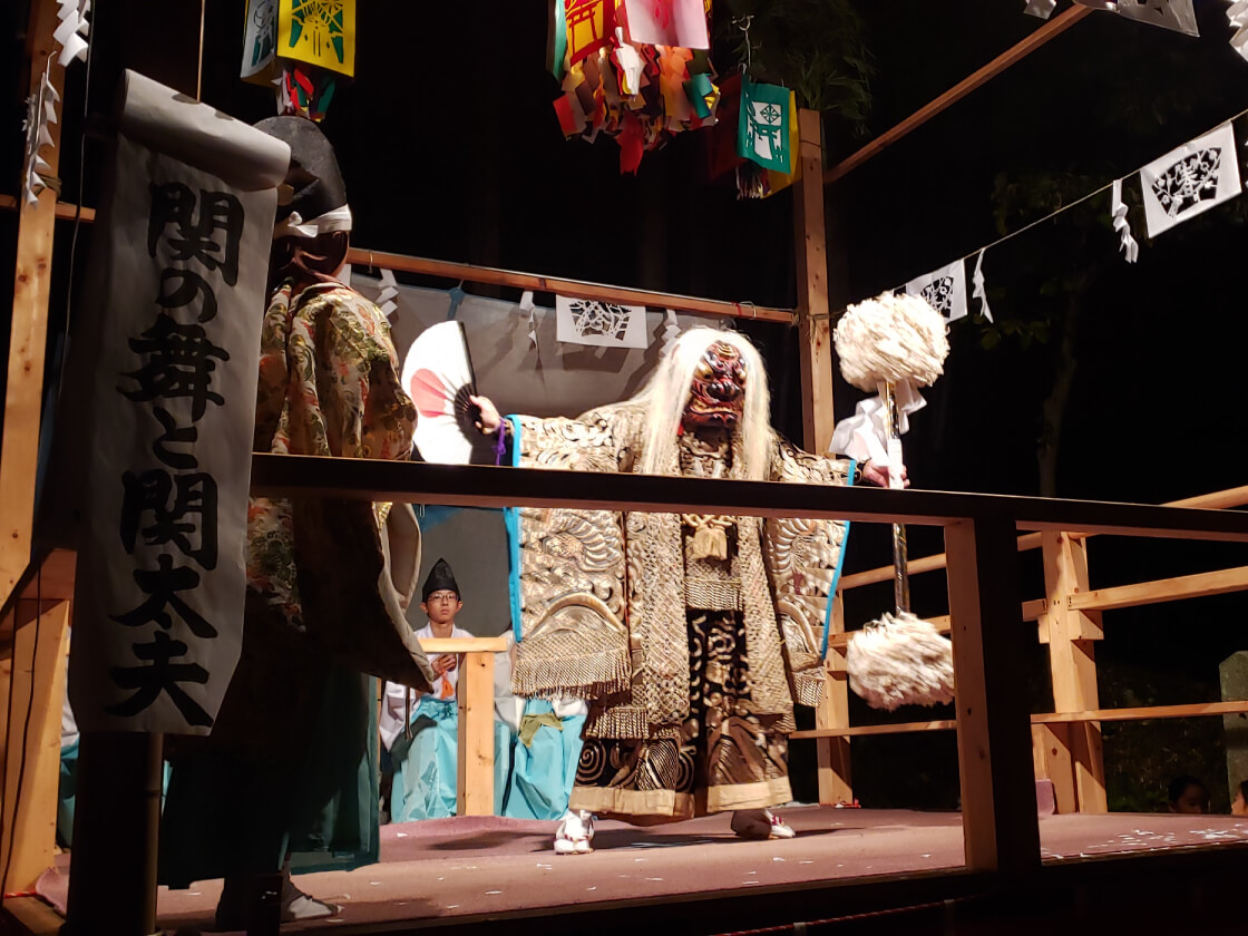 秋季大祭では、短めに簡略化した演目もあるものの、「神降ろしの舞」に始まり、締めの「関の舞」まで十二神祇を通しで、夜6時半頃から約2時間かけて舞います。