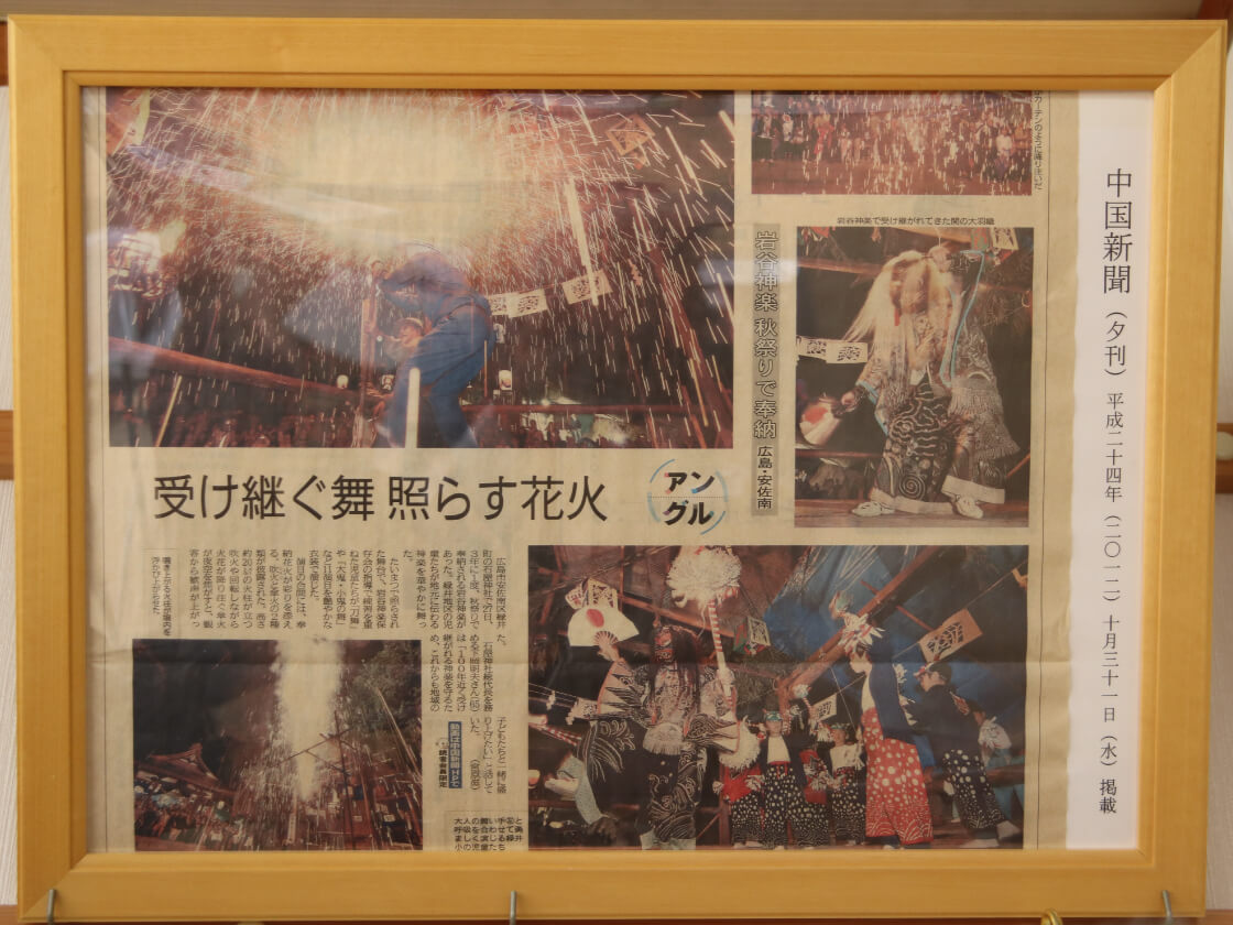 そのほか、安佐南区文化の祭典「あさみなみ伝統神楽祭」、八木梅林公園の梅林春こい祭、宇那木神社の七五三などでもいくつかの演目を披露することがあります。出演予定は岩谷神楽保存会のHPでも告知しています。また動画もYouTubeなどで公開されていますので、「岩谷神楽」で検索してご視聴ください。