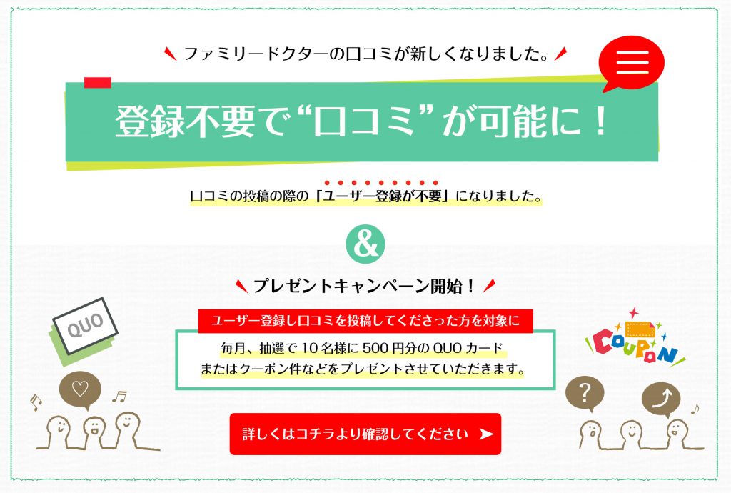 平素よりファミリードクターのご利用をありがとうございます。 この度ファミリードクターでは、ユーザー様により便利にご利用いただけるように 病院・クリニックへの口コミが「ユーザー登録が不要」になりました。